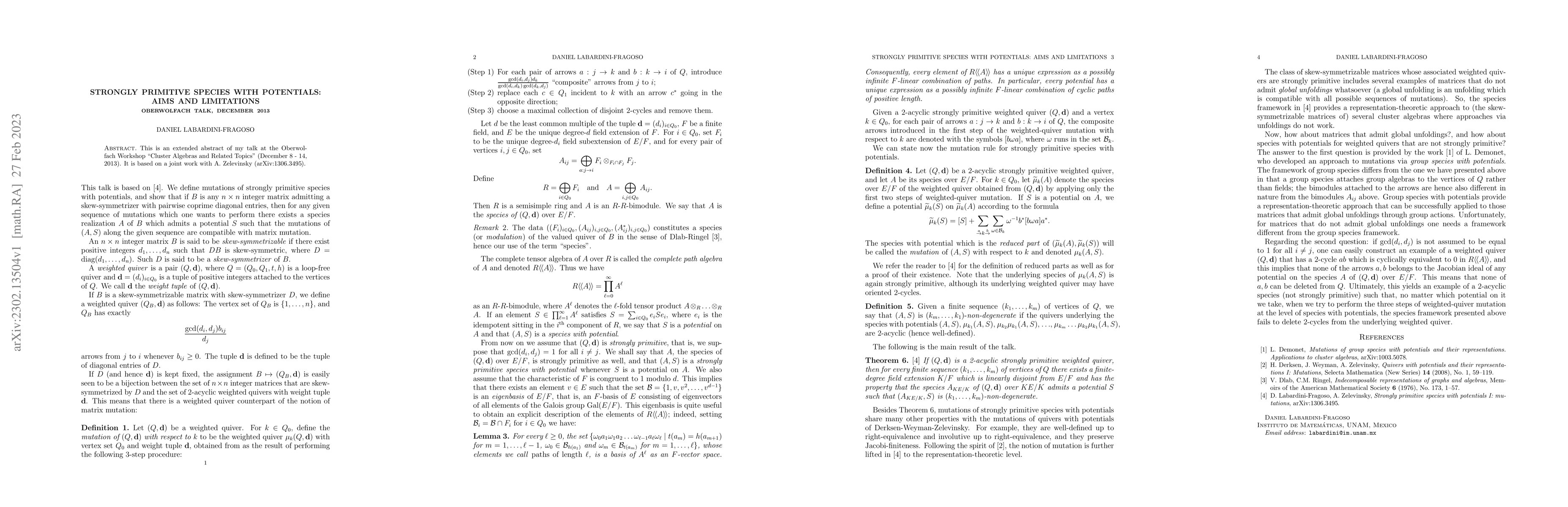 This paper explores strongly primitive species with potentials, focusing on their aims and limitations, based on collaborative work with A. Zelevinsky. The findings highlight both the theoretical potential and practical constraints of these mathematical constructs.