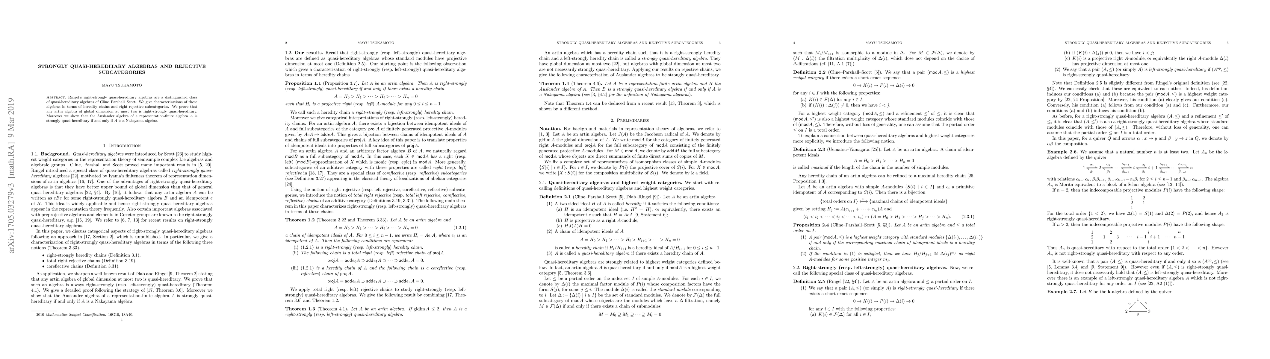 This paper characterizes right-strongly quasi-hereditary algebras using heredity chains and right rejective subcategories, and proves that any Artin algebra with global dimension at most two is right-strongly quasi-hereditary. Additionally, it establishes a condition for the Auslander algebra of a representation-finite algebra to be strongly quasi-hereditary, linking it to the Nakayama property of the algebra $A$.