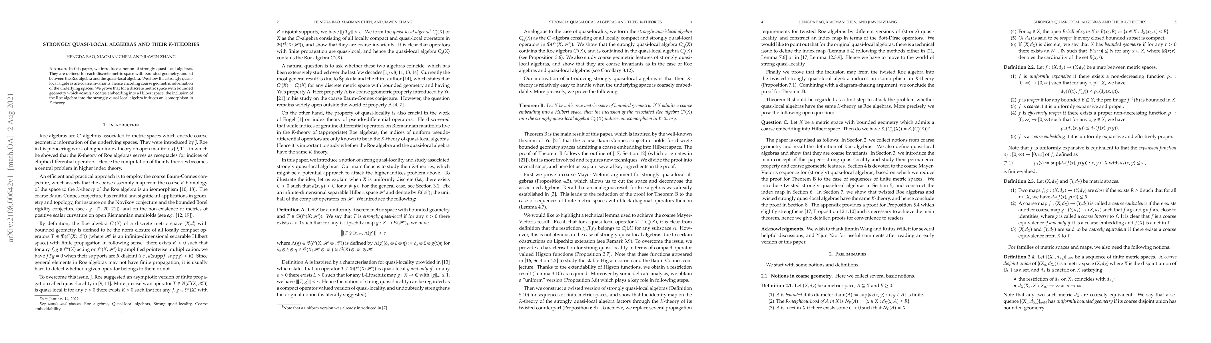 In this paper, we introduce a notion of strongly quasi-local algebras. They are defined for each discrete metric space with bounded geometry, and sit between the Roe algebra and the quasi-local algebra. We show that strongly quasi-local algebras are coarse invariants, hence encoding coarse geometric information of the underlying spaces. We prove that for a discrete metric space with bounded geometry which admits a coarse embedding into a Hilbert space, the inclusion of the Roe algebra into the strongly quasi-local algebra induces an isomorphism in $K$-theory.