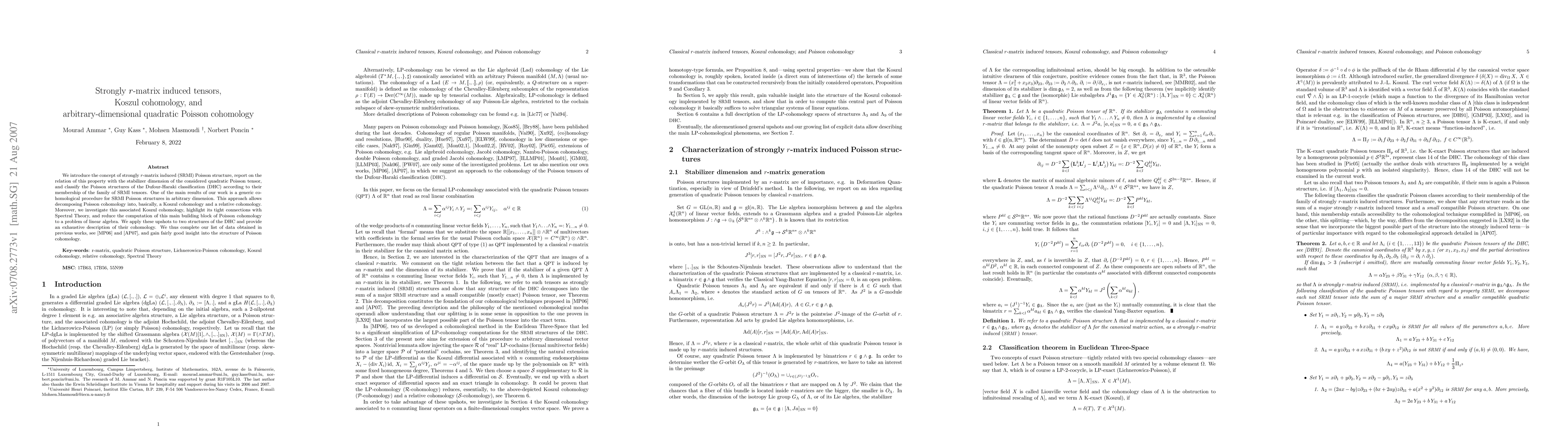 We introduce the concept of strongly $r$-matrix induced ({\small SRMI}) Poisson structure, report on the relation of this property with the stabilizer dimension of the considered quadratic Poisson tensor, and classify the Poisson structures of the Dufour-Haraki classification (DHC) according to their membership of the family of {\small SRMI} tensors. One of the main results of our work is a generic cohomological procedure for {\small SRMI} Poisson structures in arbitrary dimension. This approach allows decomposing Poisson cohomology into, basically, a Koszul cohomology and a relative cohomology. Moreover, we investigate this associated Koszul cohomology, highlight its tight connections with Spectral Theory, and reduce the computation of this main building block of Poisson cohomology to a problem of linear algebra. We apply these upshots to two structures of the DHC and provide an exhaustive description of their cohomology. We thus complete our list of data obtained in previous works, see \cite{MP} and \cite{AMPN}, and gain fairly good insight into the structure of Poisson cohomology.