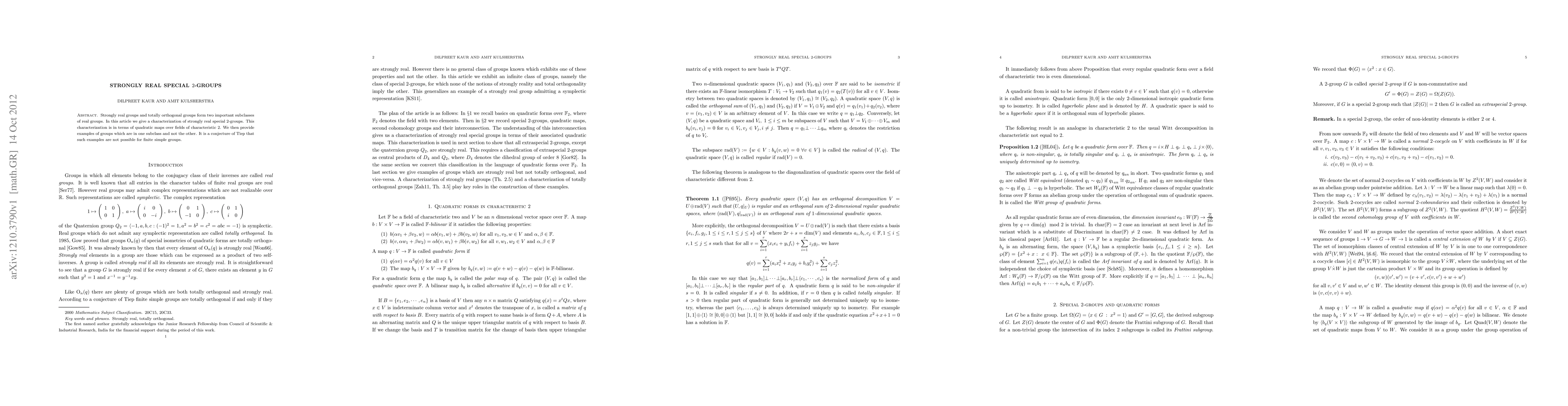 Strongly real groups and totally orthogonal groups form two important subclasses of real groups. In this article we give a characterization of strongly real special 2-groups. This characterization is in terms of quadratic maps over fields of characteristic 2. We then provide examples of groups which are in one subclass and not the other.
