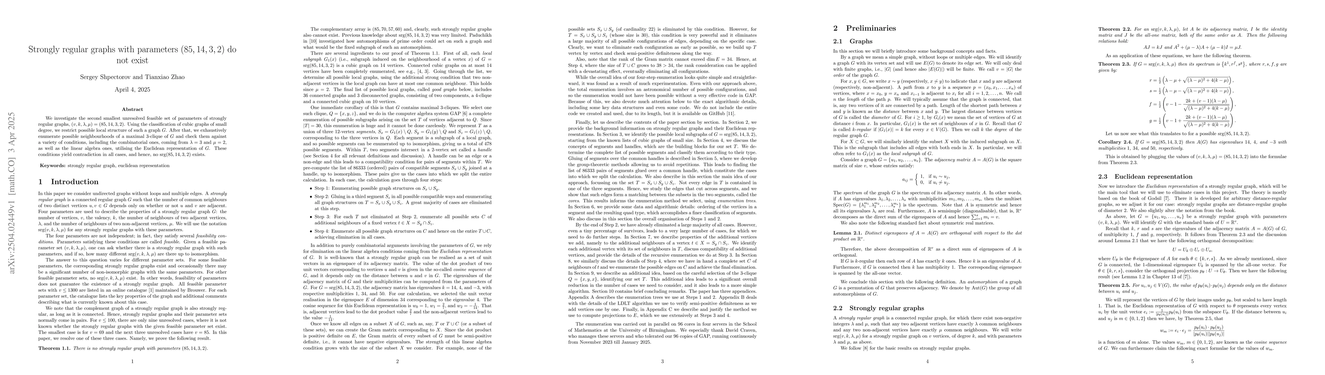 Researchers investigated whether strongly regular graphs with specific parameters (85,14,3,2) exist and found that no such graph exists due to contradictions in combinatorial and linear algebra conditions.
