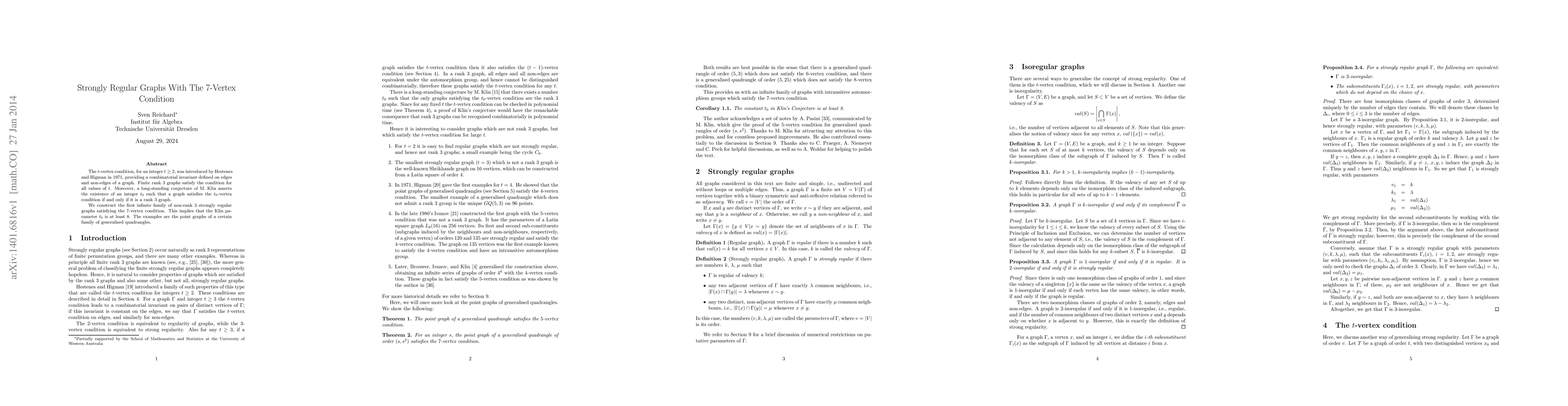 The $t$-vertex condition, for an integer $t\ge 2$, was introduced by Hestenes and Higman in 1971, providing a combinatorial invariant defined on edges and non-edges of a graph. Finite rank 3 graphs satisfy the condition for all values of $t$. Moreover, a long-standing conjecture of M. Klin asserts the existence of an integer $t_0$ such that a graph satisfies the $t_0$-vertex condition if and only if it is a rank 3 graph. We construct the first infinite family of non-rank 3 strongly regular graphs satisfying the $7$-vertex condition. This implies that the Klin parameter $t_0$ is at least 8. The examples are the point graphs of a certain family of generalised quadrangles.