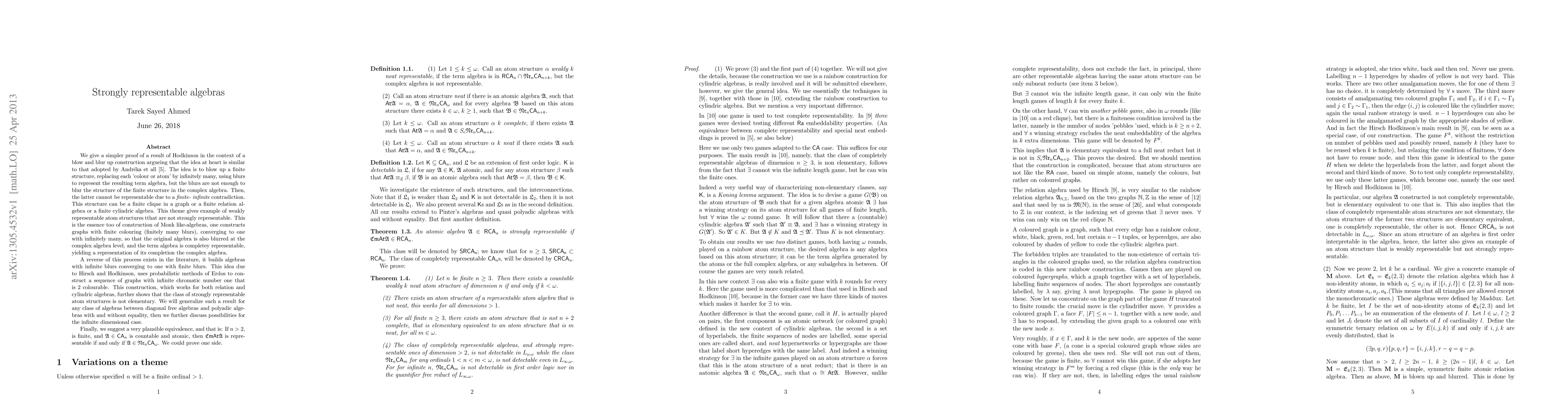 We give a simpler proof of a result of Hodkinson in the context of a blow and blur up construction argueing that the idea at heart is similar to that adopted by Andr\'eka et all \cite{sayed}. The idea is to blow up a finite structure, replacing each 'colour or atom' by infinitely many, using blurs to represent the resulting term algebra, but the blurs are not enough to blur the structure of the finite structure in the complex algebra. A reverse of this process exists in the literature, it builds algebras with infinite blurs converging to one with finite blurs. This idea due to Hirsch and Hodkinson, uses probabilistic methods of Erdos to construct a sequence of graphs with infinite chromatic number one that is 2 colourable. This construction, which works for both relation and cylindric algebras, further shows that the class of strongly representable atom structures is not elementary. We will generalize such a result for any class of algebras between diagonal free algebras and polyadic algebras with and without equality, then we further discuss possibilities for the infinite dimensional case. Finally, we suggest a very plausible equivalence, and that is: If $n>2$, is finite, and $\A\in \CA_n$ is countable and atomic, then $\Cm\At\A$ is representable if and only if $\A\in \Nr_n\CA_{\omega}$. We could prove one side.