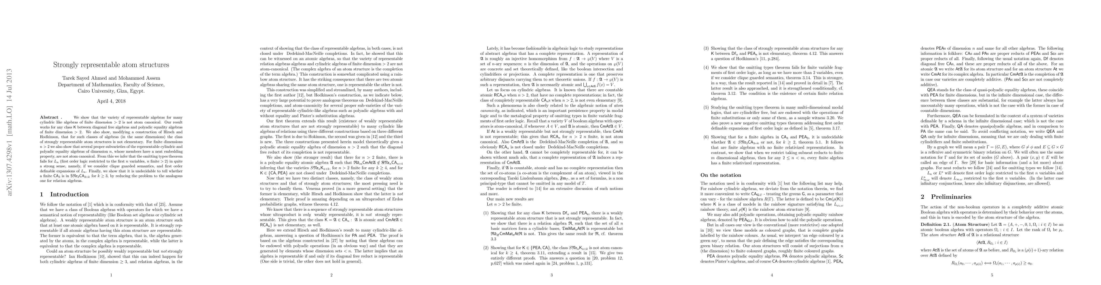 In this paper we give an alternative construction using Monk like algebras that are binary generated to show that the class of strongly representable atom structures is not elementary. The atom structures of such algebras are cylindric basis of relation algebras, both algebras are based on one graph such that both the relation and cylindric algebras are representable if and only if the chromatic number of the graph is infinite. We also relate the syntactic notion of algebras having a (complete) neat embedding property to the semantical notion of having various forms of (complete) relativized representations. Finally, we show that for n>5, the problemn as to whether a finite algebra is in the class SNr_3CA_6 is undecidable. In contrast, we show that for a finite algebra of arbitary finite dimensions that embed into extra dimensions of a another finite algebra, then this algebra have a finite relativized representation. Finally we devise what we call neat games, for such a game if \pe\ has a \ws \ on an atomic algebra \A in certain atomic game and \pa has a \ws in another atomic game, then such algebras are elementary equivalent to neat reducts, but do not have relativized (local) complete represenations. From such results, we infer that the omitting types theorem for finite variable fragments fails even if we consider clique guarded semantics. The size of cliques are determined by the number of pebbles used by \pa\.