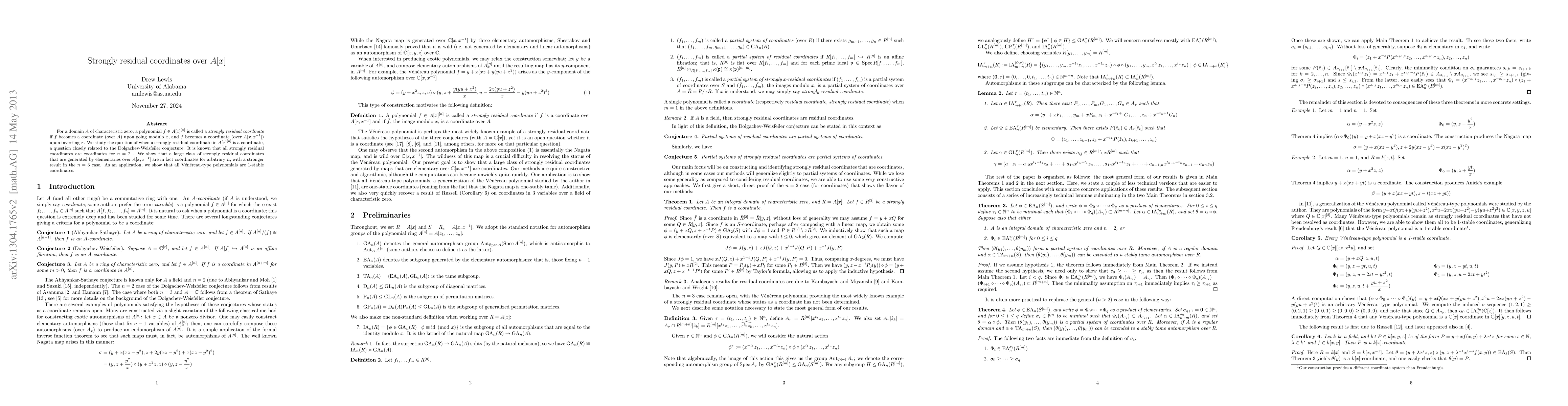 For a domain A of characteristic zero, a polynomial f over A[x] is called a strongly residual coordinate if f becomes a coordinate (over A) upon going modulo x, and f becomes a coordinate upon inverting x. We study the question of when a strongly residual coordinate is a coordinate, a question closely related to the Dolgachev-Weisfeiler conjecture. It is known that all strongly residual coordinates are coordinates for n=2 . We show that a large class of strongly residual coordinates that are generated by elementaries upon inverting x are in fact coordinates for arbitrary n, with a stronger result in the n=3 case. As an application, we show that all Venereau-type polynomials are 1-stable coordinates.