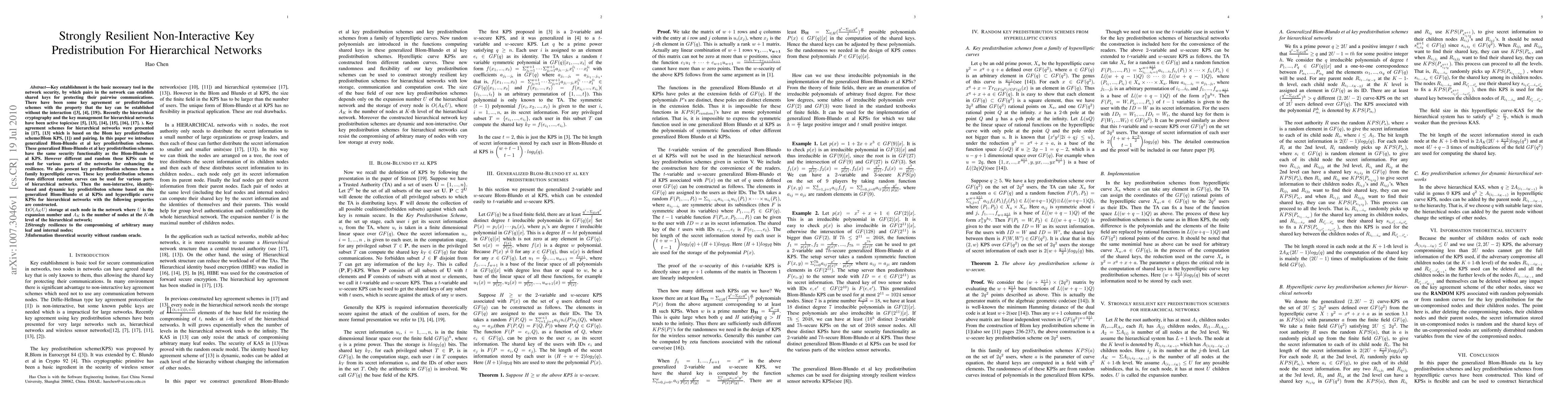 This paper introduces generalized key predistribution schemes for hierarchical networks, enhancing resilience through non-interactive, identity-based methods. The schemes utilize both generalized Blom-Blundo schemes and hyperelliptic curve-based methods, offering strong resilience and information theoretical security without random oracles.