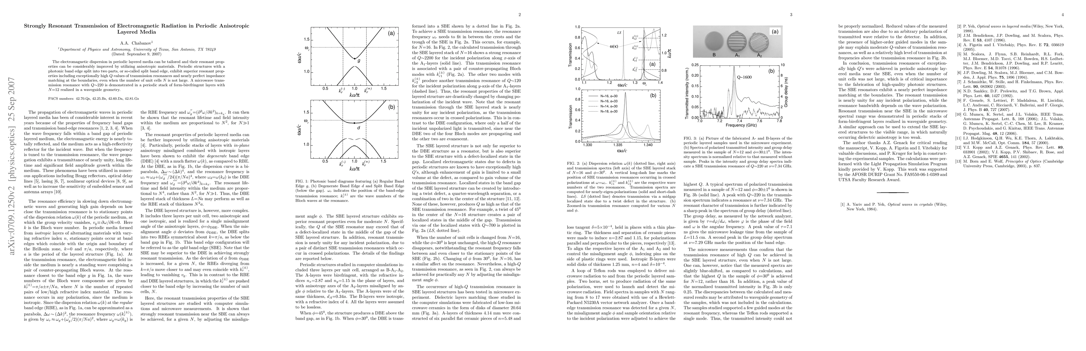 This paper demonstrates that periodic anisotropic layered media can achieve strongly resonant electromagnetic transmission with high Q-values and near-perfect impedance matching, even with a limited number of unit cells, as shown by a microwave resonance with Q~220 in a 12-layer waveguide structure.