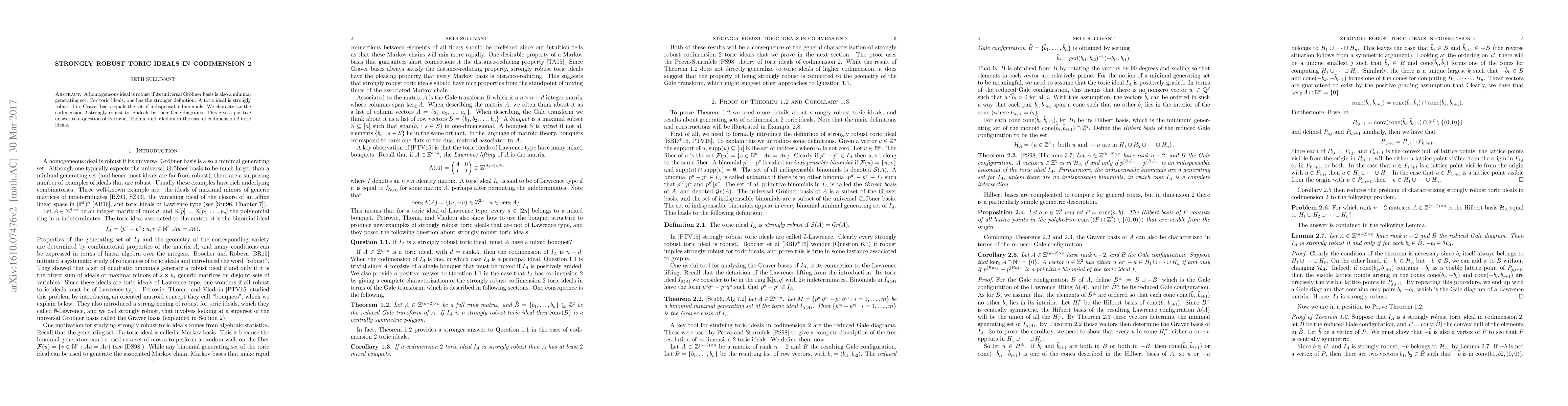 A homogeneous ideal is robust if its universal Gr\"obner basis is also a minimal generating set. For toric ideals, one has the stronger definition: A toric ideal is strongly robust if its Graver basis equals the set of indispensable binomials. We characterize the codimension 2 strongly robust toric ideals by their Gale diagrams. This gives a positive answer to a question of Petrovic, Thoma, and Vladoiu in the case of codimension 2 toric ideals.