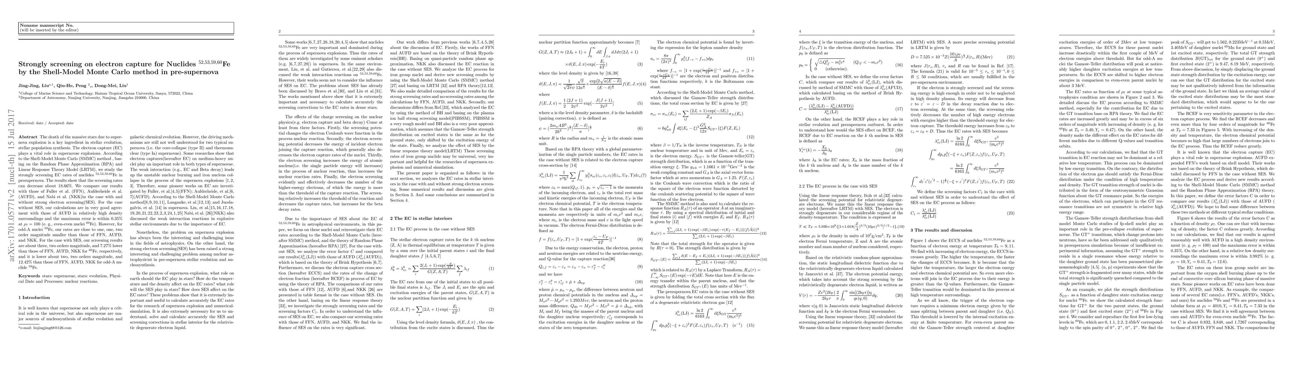 The death of the massive stars due to supernova explosion is a key ingredient in stellar evolution, stellar population synthesis. The electron capture (EC) plays a vital role in supernovae explosions. According to the Shell-Model Monte Carlo (SMMC) method, basing onthe Random Phase Approximation (RPA) and Linear Response Theory Model (LRTM), we study the strongly screening EC rates of nuclides $^{52, 53, 59, 60}$Fe in presupernova. The results show that the screening rates can decrease about 18.66\%. We compare our results with those of Fuller et al. (FFN), Aufderheide et al. (AUFD), and Nabi et al. (NKK)in the case with and without strong electron screening(SES). For the case without SES, our calculations are in very good agreement with those of AUFD in relatively high density surroundings and the maximum error is within 0.35\% at $\rho_7=100$ (e. g., even-even nuclei $^{60}$Fe). However, for odd-A nuclei$^{59}$Fe, our rates are close to one, one, two order magnitude smaller than those of FFN, AUFD, and NKK. For the case with SES, our screening results are about three, two orders magnitude, and 7.27\% lower than those of FFN, AUFD, NKK for $^{60}$Fe, respectively, and it is lower about two, two orders magnitude, and 12.42\% than those of FFN, AUFD, NKK for odd-A nuclide $^{59}$Fe.