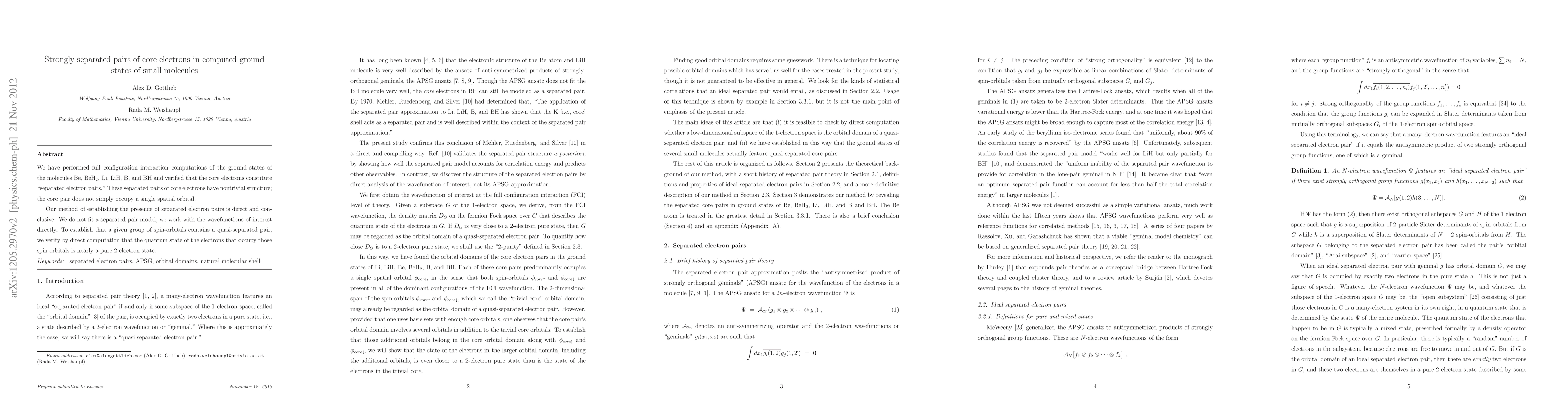 We have performed full configuration interaction computations of the ground states of the molecules Be, BeH_2, Li, LiH, B, and BH and verified that the core electrons constitute "separated electron pairs." These separated pairs of core electrons have nontrivial structure; the core pair does not simply occupy a single spatial orbital. Our method of establishing the presence of separated electron pairs is direct and conclusive. We do not fit a separated pair model; we work with the wavefunctions of interest directly. To establish that a given group of spin-orbitals contains a quasi-separated pair, we verify by direct computation that the quantum state of the electrons that occupy those spin-orbitals is nearly a pure 2-electron state.