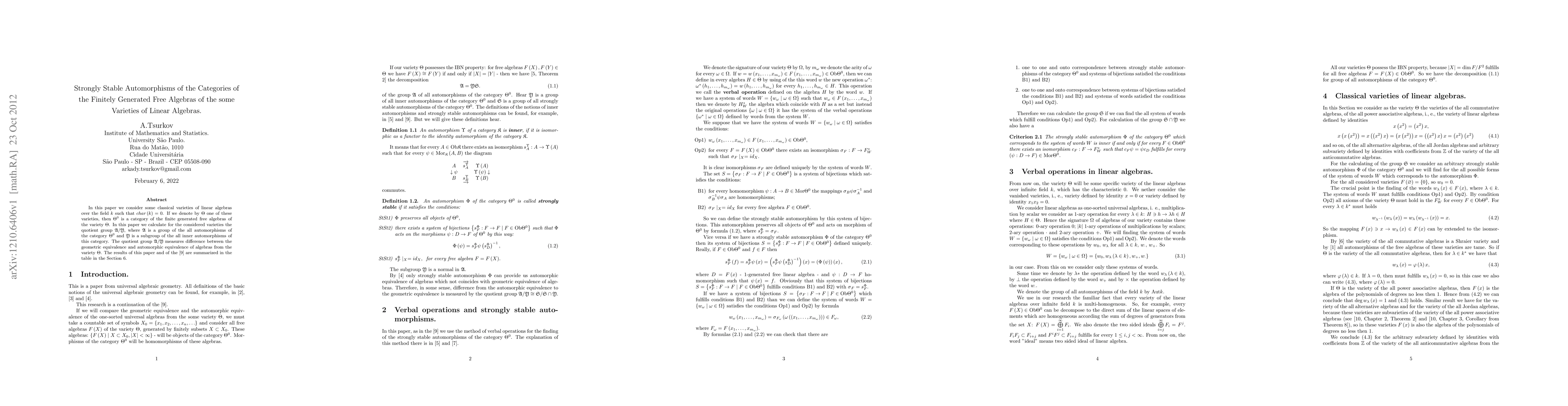 In this paper we consider some classical varieties of linear algebras over the field which has characteristic 0. For every considered variety we take a category of the finite generated free algebras of this variety. And for every this category we calculate the quotient group of the group of the all automorphisms of this category over the subgroup of the all inner automorphisms. This quotient group measures difference between the geometric equivalence and automorphic equivalence of algebras from this variety.