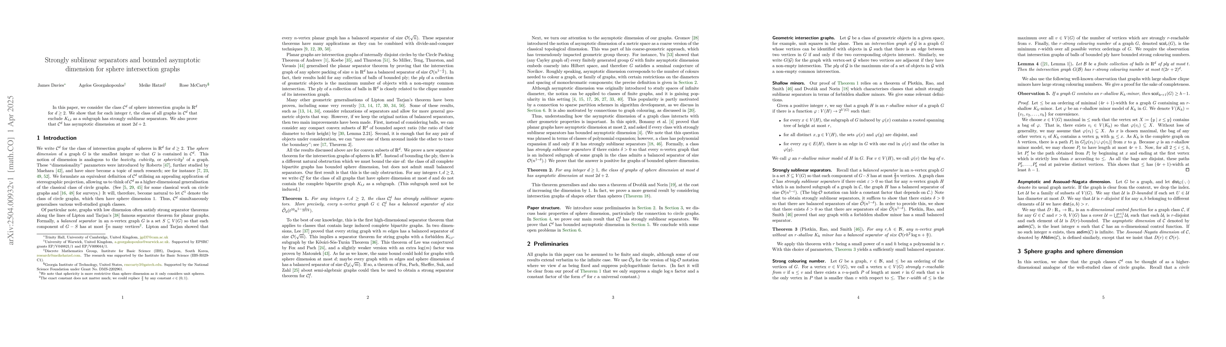 Researchers show that sphere intersection graphs can have strongly sublinear separators for certain excluded subgraphs, and these graphs have bounded asymptotic dimension.