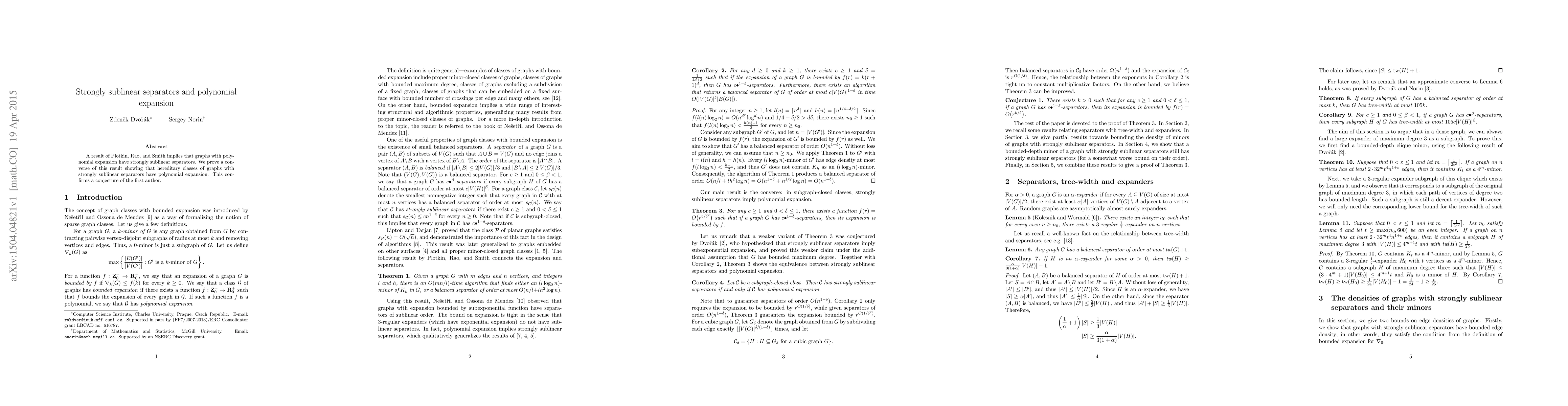 The paper proves a converse to a result by Plotkin, Rao, and Smith, demonstrating that hereditary classes of graphs with strongly sublinear separators have polynomial expansion, confirming a conjecture of the first author.