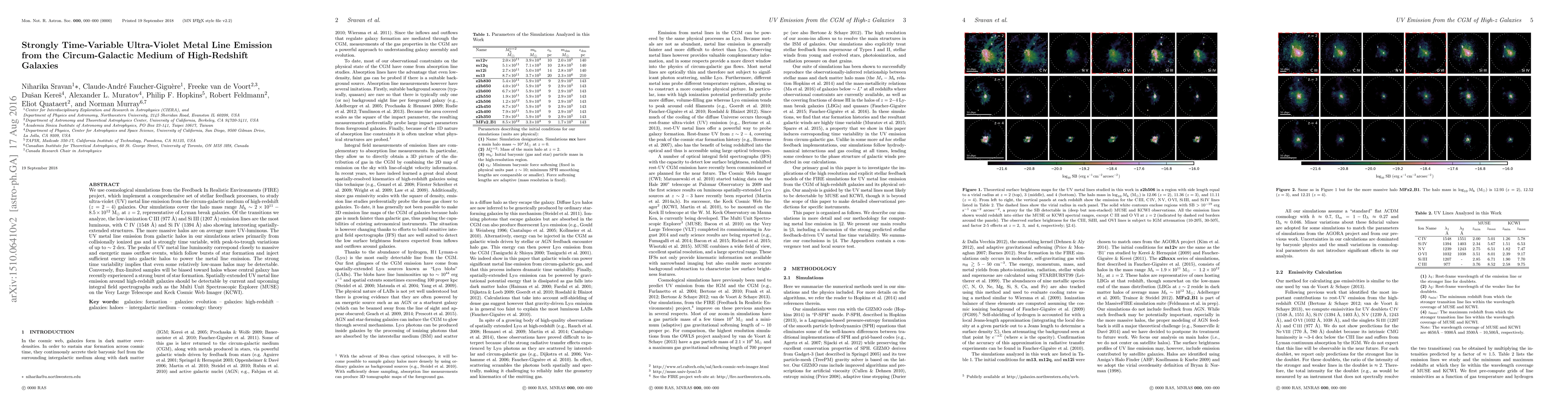 This study uses FIRE cosmological simulations to analyze ultra-violet metal line emissions from high-redshift galaxies' circum-galactic medium, finding that low-ionization C III and Si III lines are the most luminous. The UV emission is strongly time-variable, peaking during massive star formation bursts, and detectable via current spectrographs.