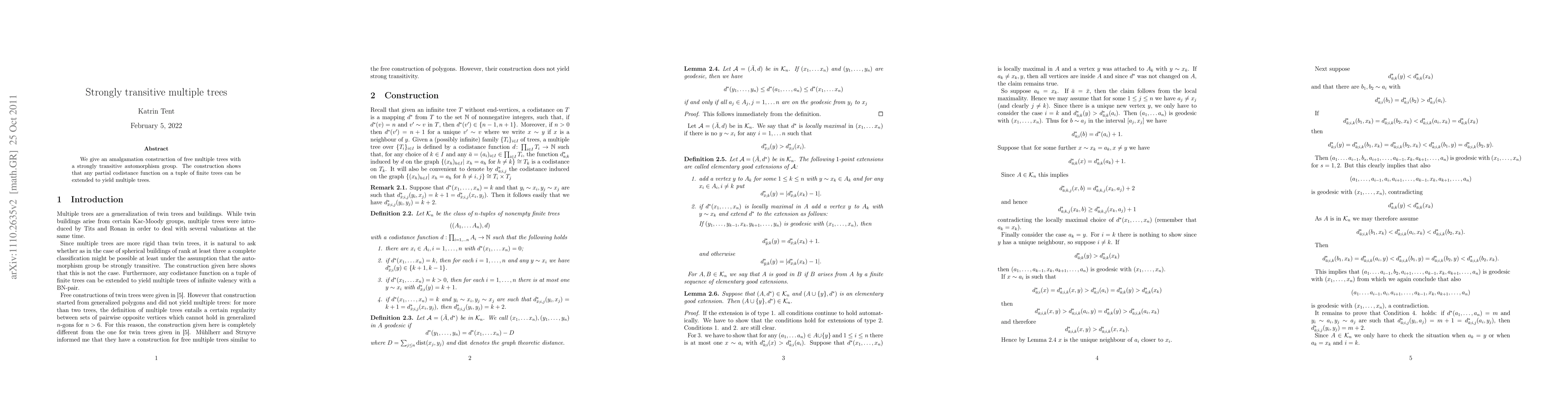We give an amalgamation construction of free multiple trees with a strongly transitive automorphism group. The construction shows that any partial codistance function on a tuple of finite trees can be extended to yield multiple trees.