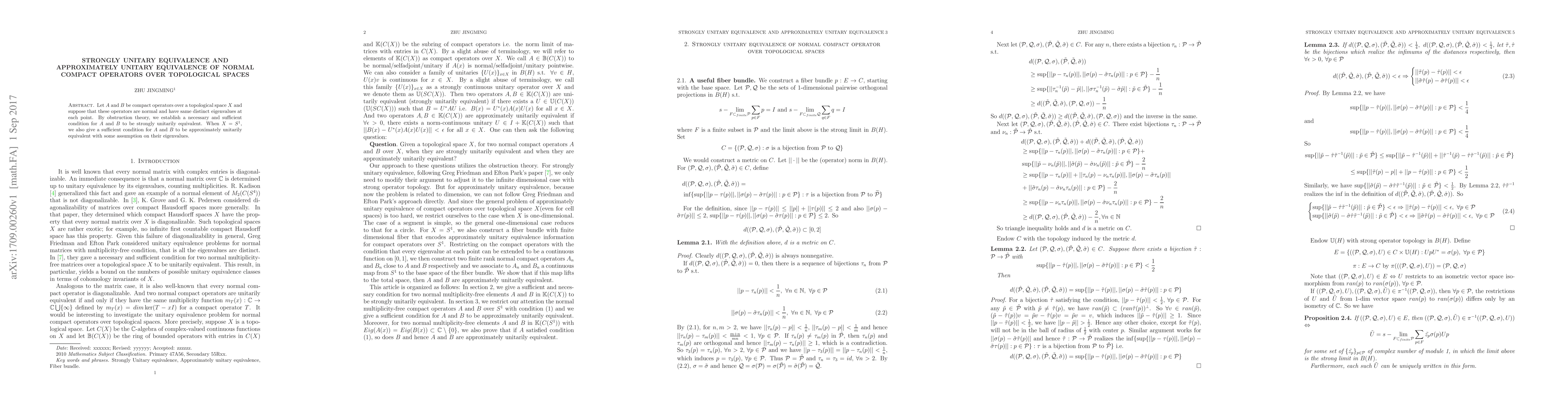 Summary: This paper establishes necessary and sufficient conditions for strongly unitary equivalence of normal compact operators over a topological space, with a focus on $S^1$. It also provides a sufficient condition for approximate unitary equivalence when the operators share distinct eigenvalues.