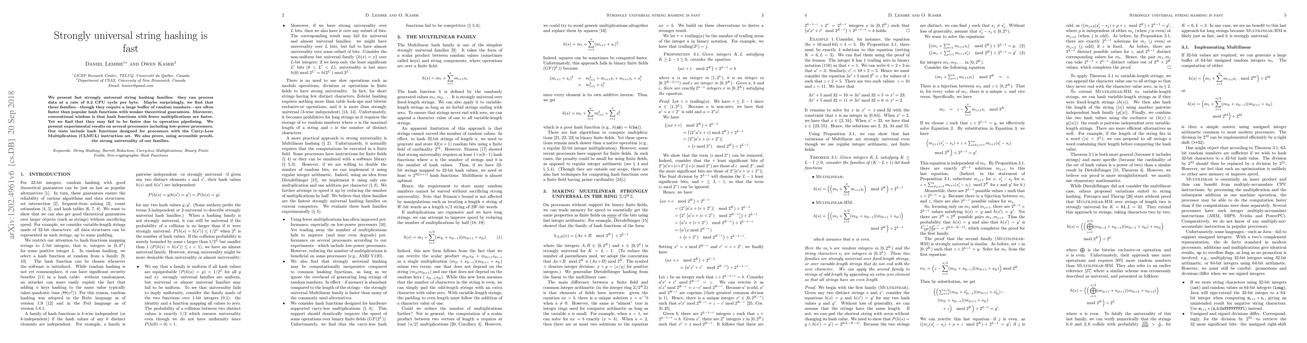 Researchers found that strongly universal string hashing families can process data at 0.2 CPU cycles per byte, sometimes outperforming popular hash functions despite requiring more random numbers.