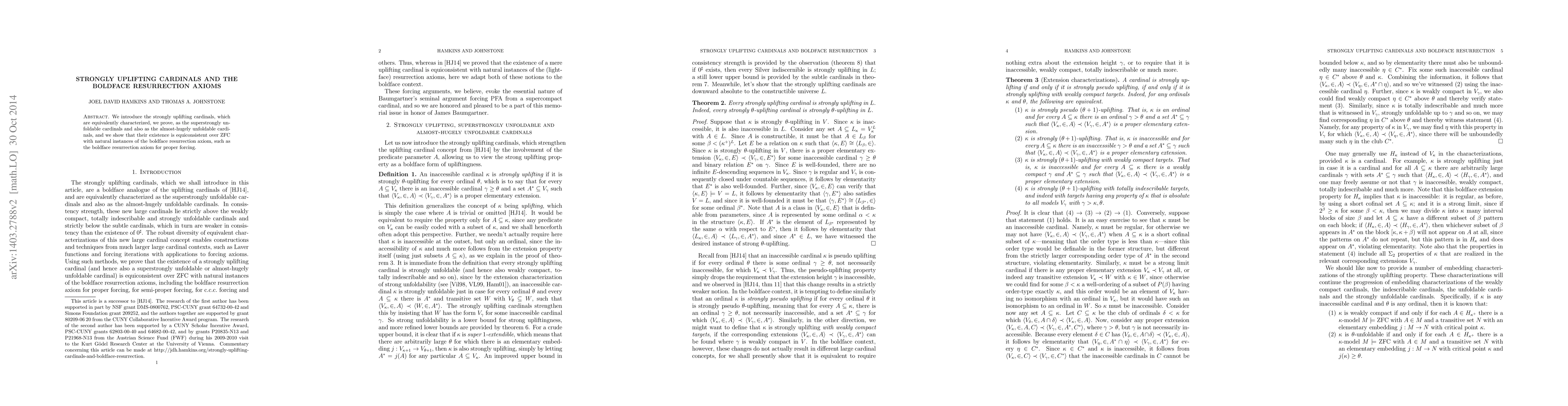 We introduce the strongly uplifting cardinals, which are equivalently characterized, we prove, as the superstrongly unfoldable cardinals and also as the almost hugely unfoldable cardinals, and we show that their existence is equiconsistent over ZFC with natural instances of the boldface resurrection axiom, such as the boldface resurrection axiom for proper forcing.