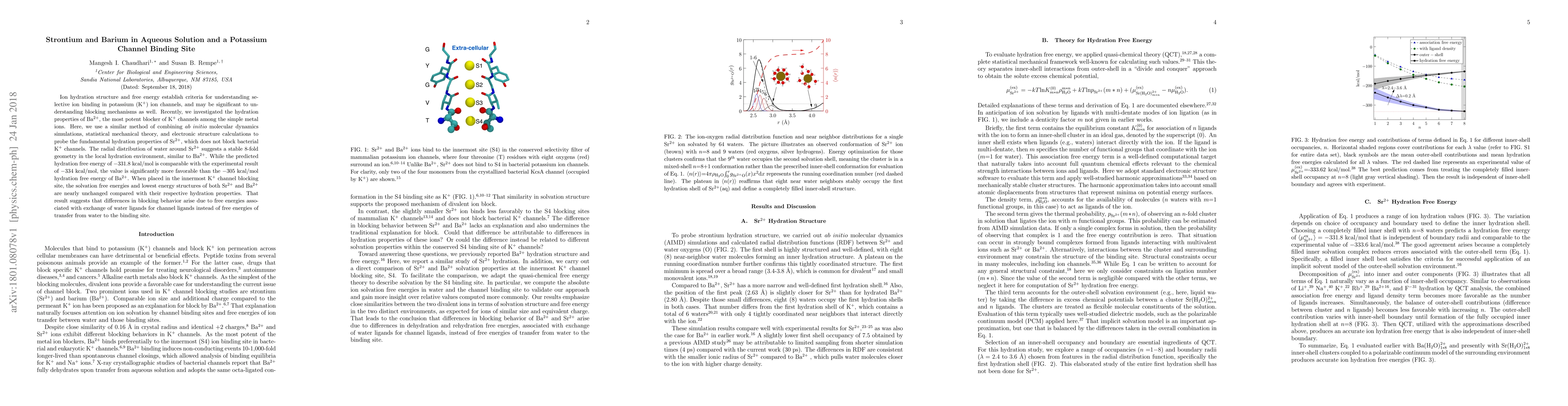 This paper investigates the hydration properties of Sr2+ and Ba2+ ions using simulations and theoretical methods, finding that Sr2+ has a stable 8-fold hydration geometry similar to Ba2+. The study suggests that differences in blocking behavior of K+ channels are due to the free energies associated with ligand exchange rather than direct hydration free energy differences.