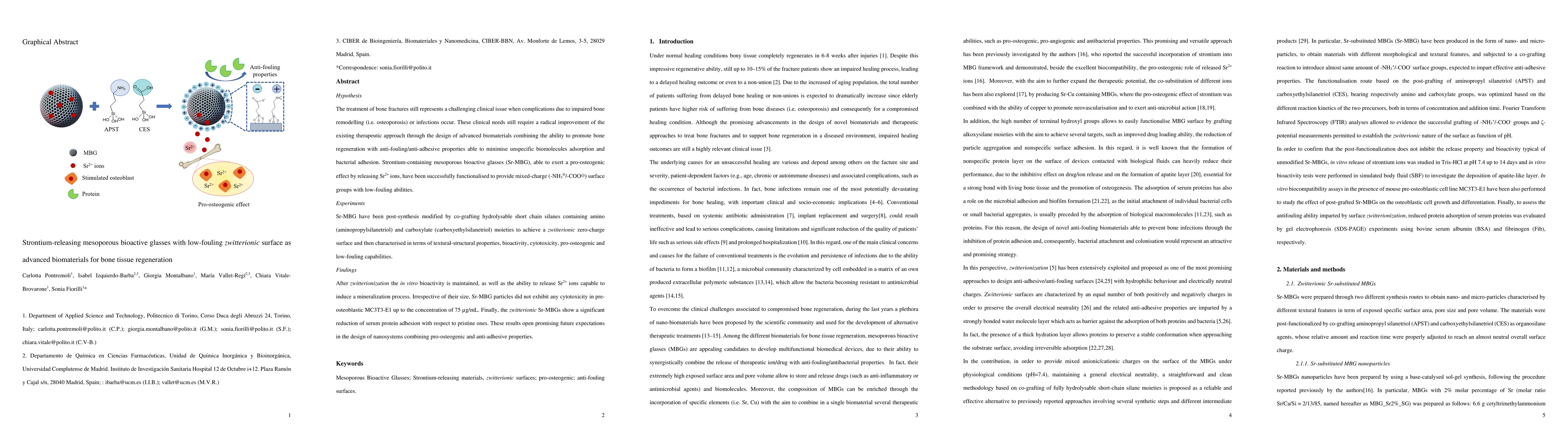 This research develops strontium-containing mesoporous bioactive glasses (Sr-MBG) with zwitterionic surfaces to enhance bone tissue regeneration. The modified Sr-MBG maintains bioactivity and Sr2+ ion release, exhibits no cytotoxicity, and significantly reduces protein adhesion, suggesting potential for advanced biomaterials in treating bone fractures.