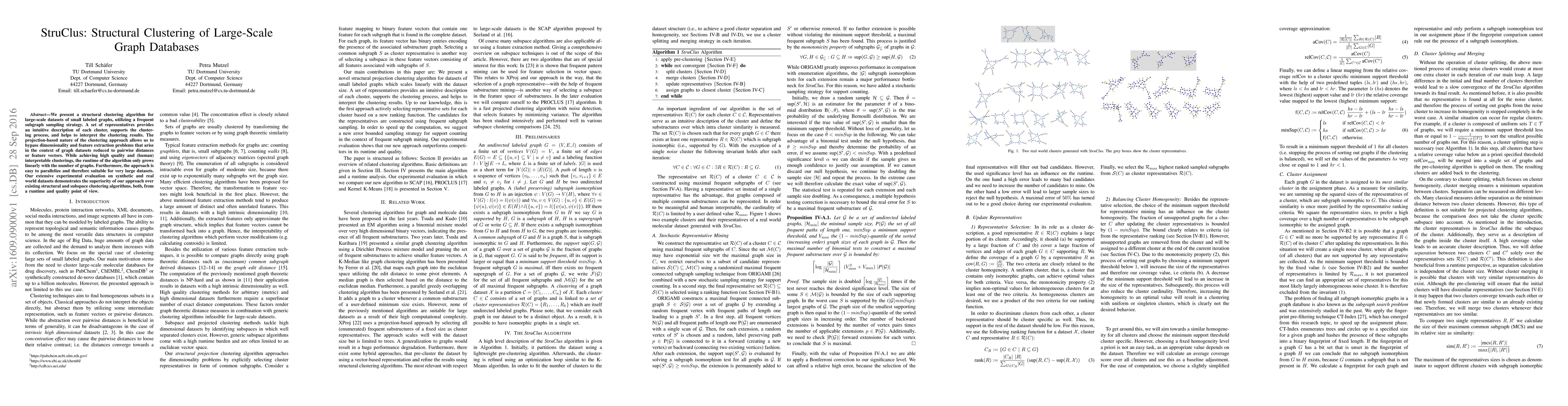 StruClus is a structural clustering algorithm for large-scale labeled graph datasets, employing frequent subgraph sampling for high-quality, interpretable clustering. The method avoids dimensionality issues and scales linearly with data size, making it suitable for parallel processing and large datasets.