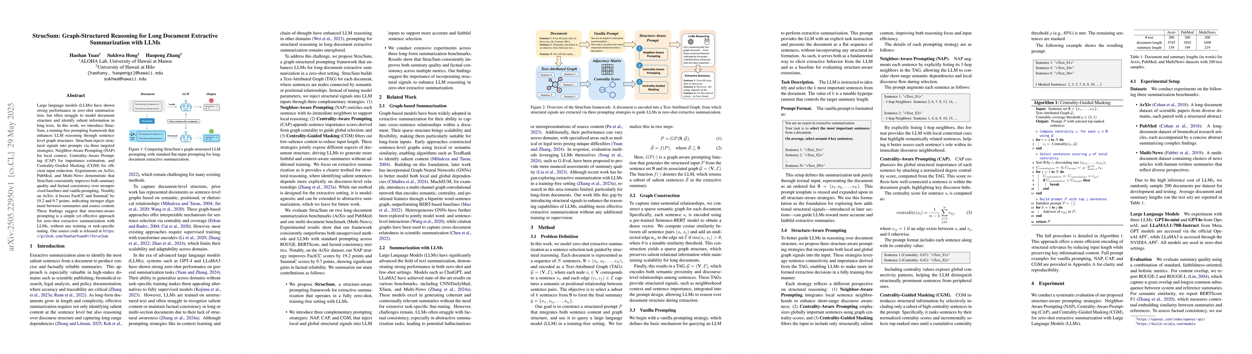 StrucSum improves zero-shot extractive summarization with LLMs by injecting structural signals into prompts through graph structures, achieving higher summary quality and factual consistency without training or task-specific tuning.
