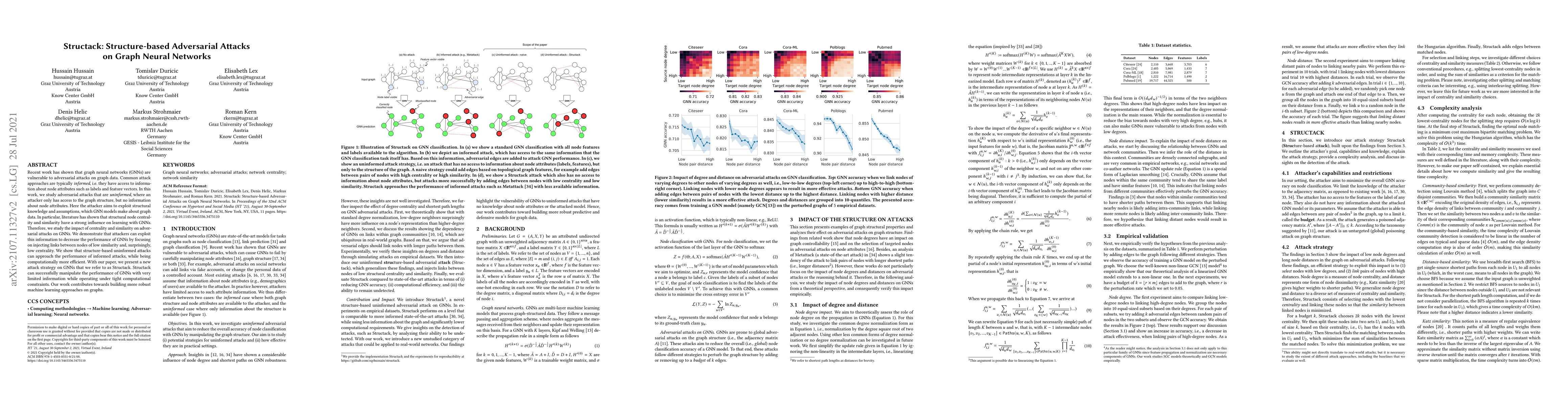 Recent work has shown that graph neural networks (GNNs) are vulnerable to adversarial attacks on graph data. Common attack approaches are typically informed, i.e. they have access to information about node attributes such as labels and feature vectors. In this work, we study adversarial attacks that are uninformed, where an attacker only has access to the graph structure, but no information about node attributes. Here the attacker aims to exploit structural knowledge and assumptions, which GNN models make about graph data. In particular, literature has shown that structural node centrality and similarity have a strong influence on learning with GNNs. Therefore, we study the impact of centrality and similarity on adversarial attacks on GNNs. We demonstrate that attackers can exploit this information to decrease the performance of GNNs by focusing on injecting links between nodes of low similarity and, surprisingly, low centrality. We show that structure-based uninformed attacks can approach the performance of informed attacks, while being computationally more efficient. With our paper, we present a new attack strategy on GNNs that we refer to as Structack. Structack can successfully manipulate the performance of GNNs with very limited information while operating under tight computational constraints. Our work contributes towards building more robust machine learning approaches on graphs.