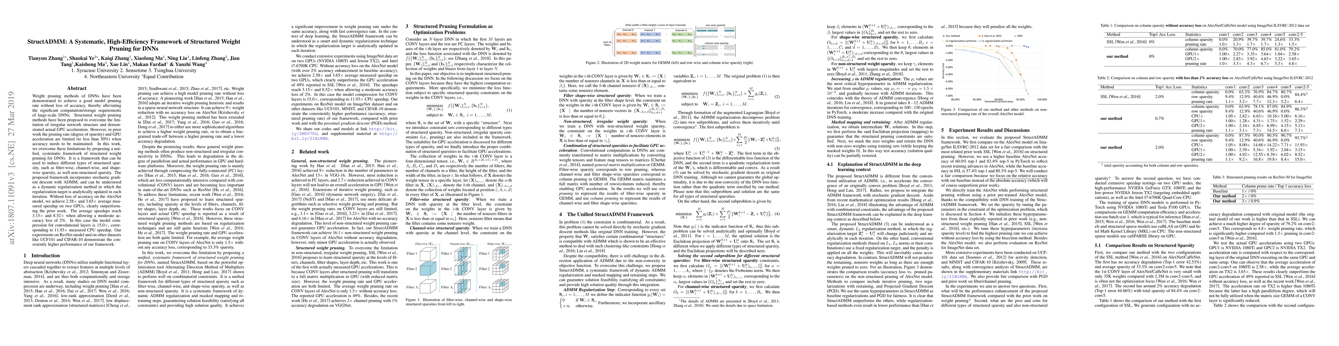 The paper introduces StructADMM, a high-efficiency framework for structured weight pruning in DNNs that achieves significant model compression and GPU acceleration without substantial loss in accuracy. The framework achieves up to 2.58X and 3.65X speedup on GPUs and 11.93X on CPUs with minor accuracy loss, outperforming previous methods.
