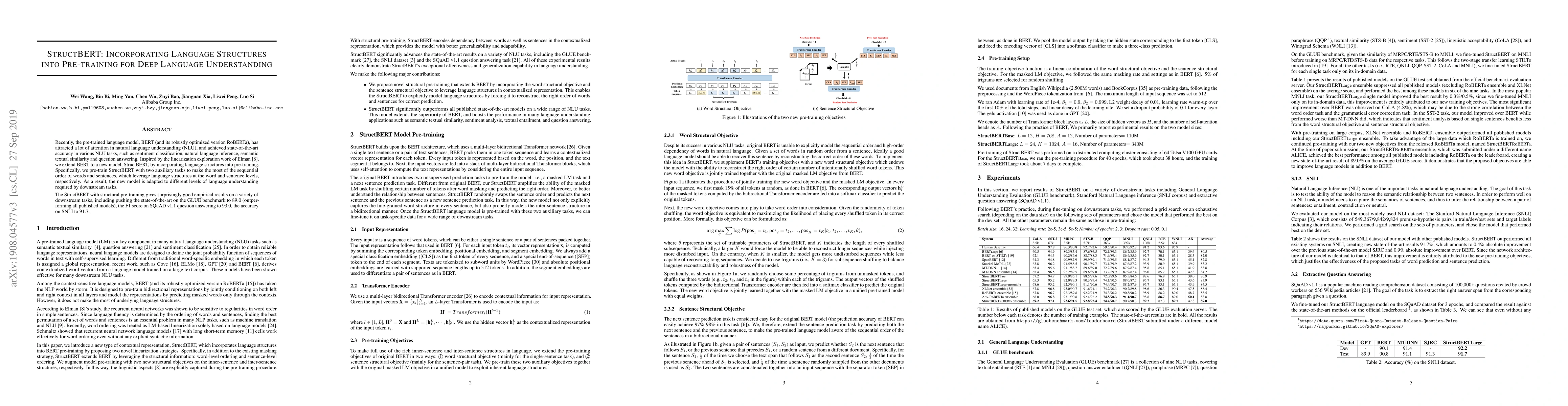 StructBERT enhances BERT by incorporating language structures through pre-training with auxiliary tasks, achieving state-of-the-art performance on GLUE, SQuAD, and SNLI benchmarks. The model leverages both word and sentence-level structures to improve deep language understanding.