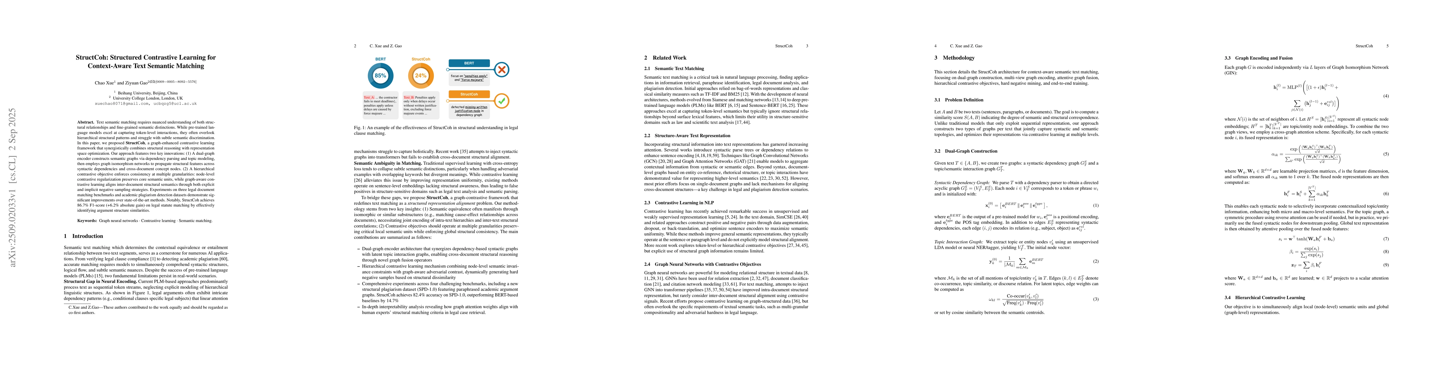 Text semantic matching requires nuanced understanding of both structural relationships and fine-grained semantic distinctions. While pre-trained language models excel at capturing token-level interactions, they often overlook hierarchical structural patterns and struggle with subtle semantic discrimination. In this paper, we proposed StructCoh, a graph-enhanced contrastive learning framework that synergistically combines structural reasoning with representation space optimization. Our approach features two key innovations: (1) A dual-graph encoder constructs semantic graphs via dependency parsing and topic modeling, then employs graph isomorphism networks to propagate structural features across syntactic dependencies and cross-document concept nodes. (2) A hierarchical contrastive objective enforces consistency at multiple granularities: node-level contrastive regularization preserves core semantic units, while graph-aware contrastive learning aligns inter-document structural semantics through both explicit and implicit negative sampling strategies. Experiments on three legal document matching benchmarks and academic plagiarism detection datasets demonstrate significant improvements over state-of-the-art methods. Notably, StructCoh achieves 86.7% F1-score (+6.2% absolute gain) on legal statute matching by effectively identifying argument structure similarities.