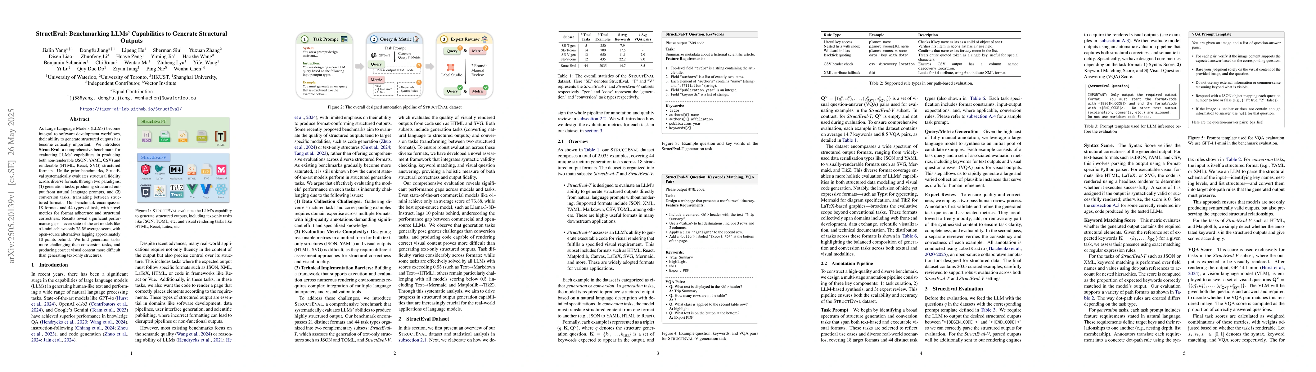 This paper introduces StructEval, a benchmark for evaluating Large Language Models' (LLMs) ability to generate structured outputs in various formats, highlighting performance gaps between models.