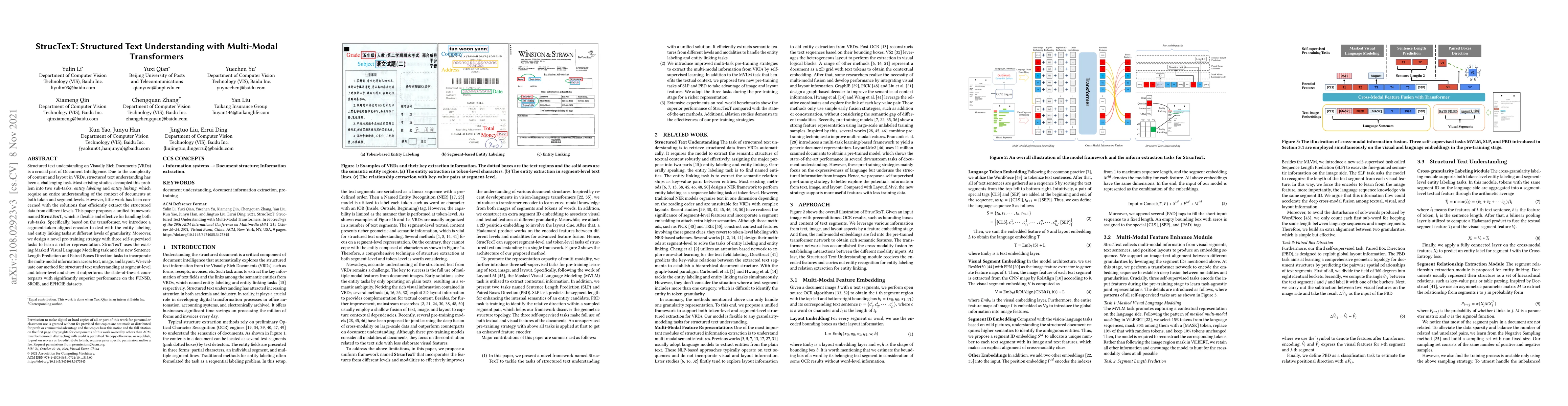 StrucTexT is a unified framework for structured text understanding in Visually Rich Documents, employing multi-modal transformers with a segment-token aligned encoder for entity labeling and linking. It uses a pre-training strategy with self-supervised tasks to enhance representation, achieving superior performance on FUNSD, SROIE, and EPHOIE datasets.