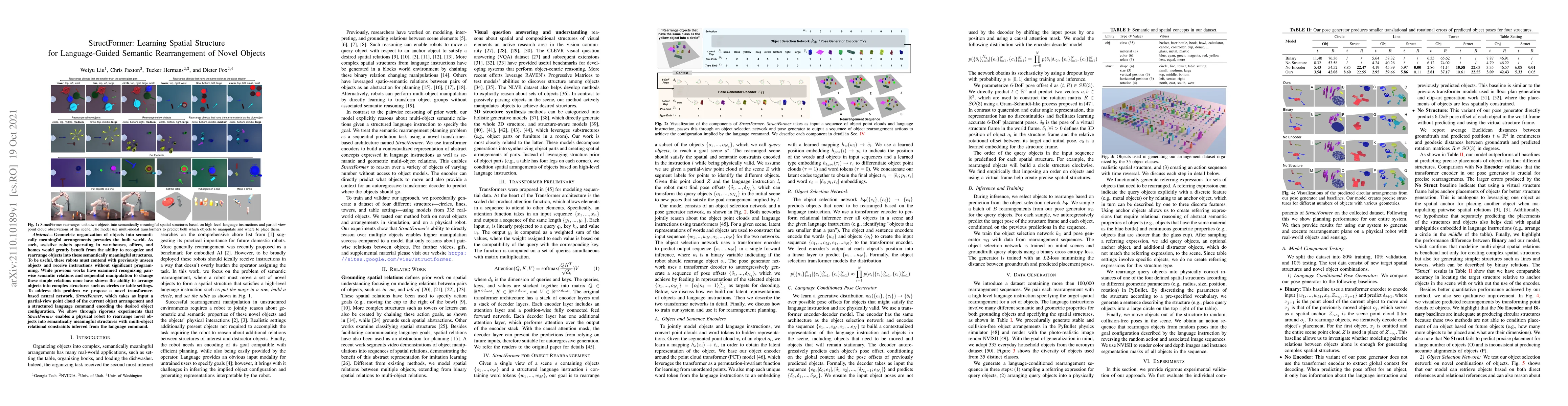 StructFormer is a transformer-based neural network designed to enable robots to rearrange novel objects into semantically meaningful structures based on language commands. It demonstrates the ability to infer complex multi-object relational constraints from language, outperforming previous methods in complex object configurations.