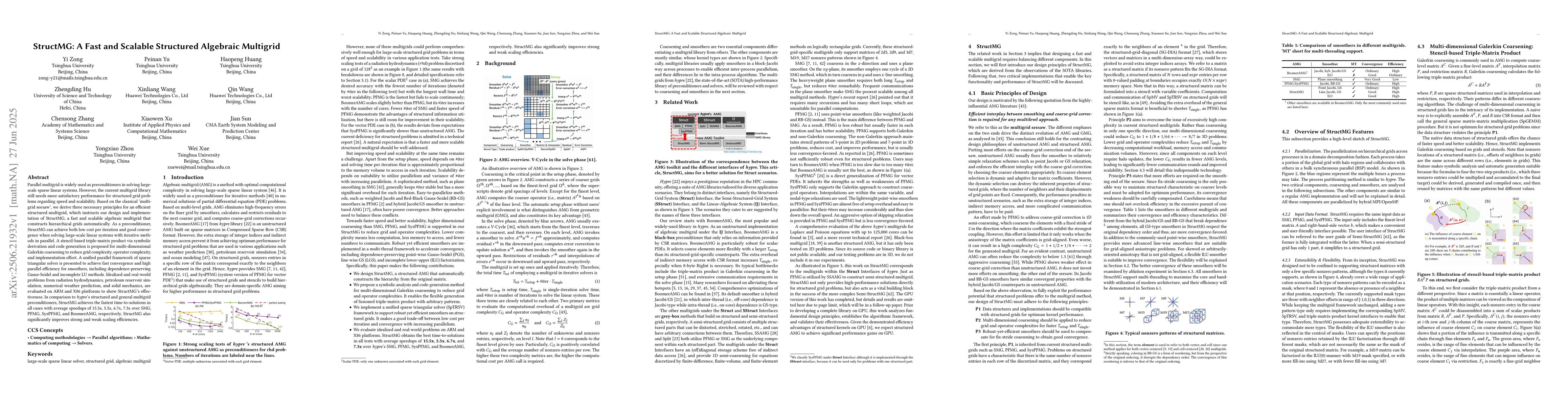 Parallel multigrid is widely used as preconditioners in solving large-scale sparse linear systems. However, the current multigrid library still needs more satisfactory performance for structured grid problems regarding speed and scalability. Based on the classical 'multigrid seesaw', we derive three necessary principles for an efficient structured multigrid, which instructs our design and implementation of StructMG, a fast and scalable algebraic multigrid that constructs hierarchical grids automatically. As a preconditioner, StructMG can achieve both low cost per iteration and good convergence when solving large-scale linear systems with iterative methods in parallel. A stencil-based triple-matrix product via symbolic derivation and code generation is proposed for multi-dimensional Galerkin coarsening to reduce grid complexity, operator complexity, and implementation effort. A unified parallel framework of sparse triangular solver is presented to achieve fast convergence and high parallel efficiency for smoothers, including dependence-preserving Gauss-Seidel and incomplete LU methods. Idealized and real-world problems from radiation hydrodynamics, petroleum reservoir simulation, numerical weather prediction, and solid mechanics, are evaluated on ARM and X86 platforms to show StructMG's effectiveness. In comparison to \textit{hypre}'s structured and general multigrid preconditioners, StructMG achieves the fastest time-to-solutions in all cases with average speedups of 15.5x, 5.5x, 6.7x, 7.3x over SMG, PFMG, SysPFMG, and BoomerAMG, respectively. StructMG also significantly improves strong and weak scaling efficiencies.