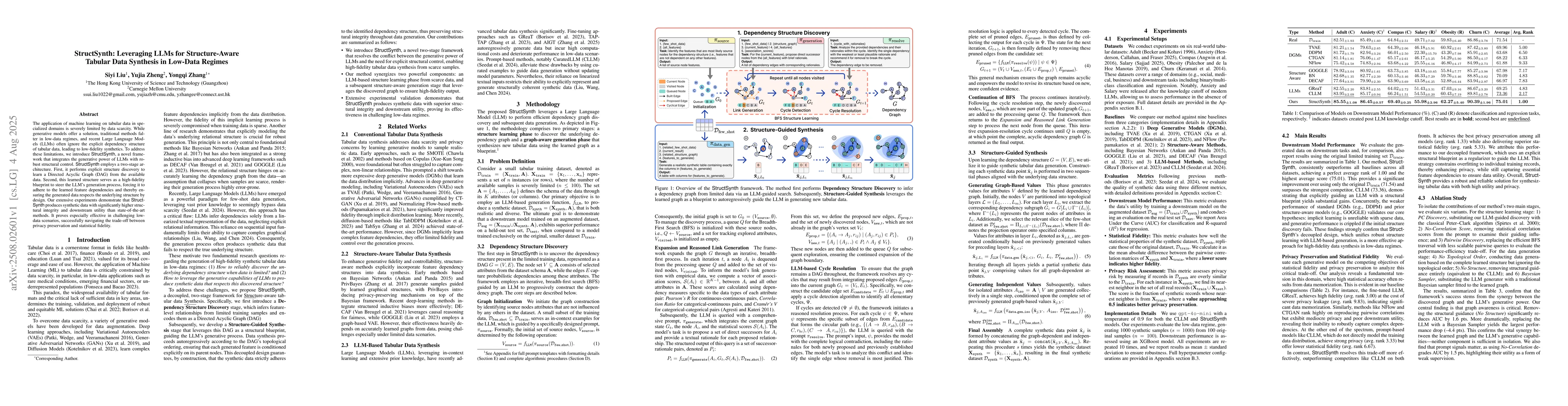 The application of machine learning on tabular data in specialized domains is severely limited by data scarcity. While generative models offer a solution, traditional methods falter in low-data regimes, and recent Large Language Models (LLMs) often ignore the explicit dependency structure of tabular data, leading to low-fidelity synthetics. To address these limitations, we introduce StructSynth, a novel framework that integrates the generative power of LLMs with robust structural control. StructSynth employs a two-stage architecture. First, it performs explicit structure discovery to learn a Directed Acyclic Graph (DAG) from the available data. Second, this learned structure serves as a high-fidelity blueprint to steer the LLM's generation process, forcing it to adhere to the learned feature dependencies and thereby ensuring the generated data respects the underlying structure by design. Our extensive experiments demonstrate that StructSynth produces synthetic data with significantly higher structural integrity and downstream utility than state-of-the-art methods. It proves especially effective in challenging low-data scenarios, successfully navigating the trade-off between privacy preservation and statistical fidelity.