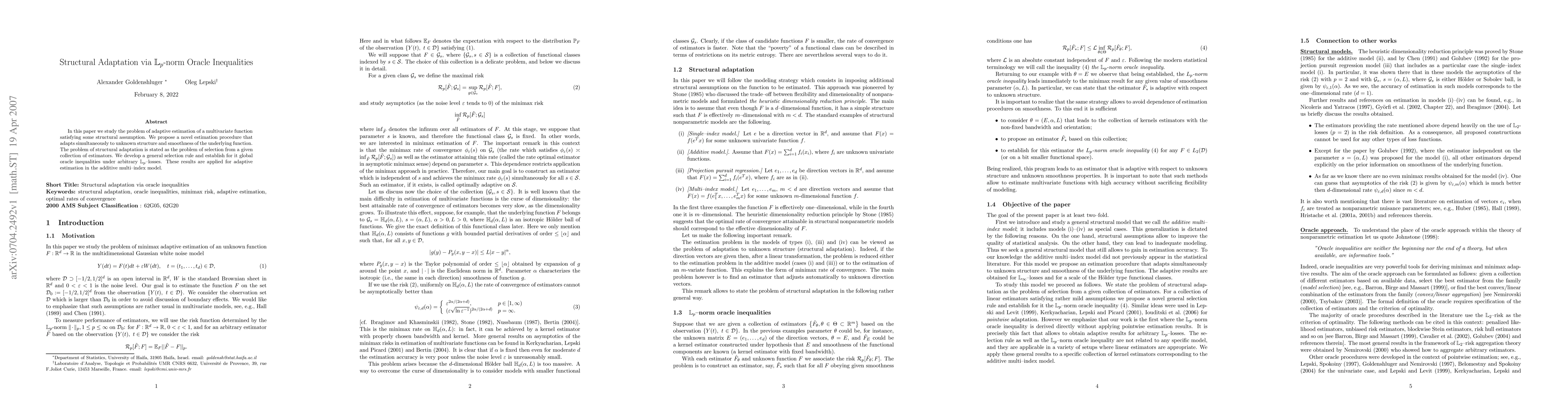 In this paper we study the problem of adaptive estimation of a multivariate function satisfying some structural assumption. We propose a novel estimation procedure that adapts simultaneously to unknown structure and smoothness of the underlying function. The problem of structural adaptation is stated as the problem of selection from a given collection of estimators. We develop a general selection rule and establish for it global oracle inequalities under arbitrary $\rL_p$--losses. These results are applied for adaptive estimation in the additive multi--index model.
