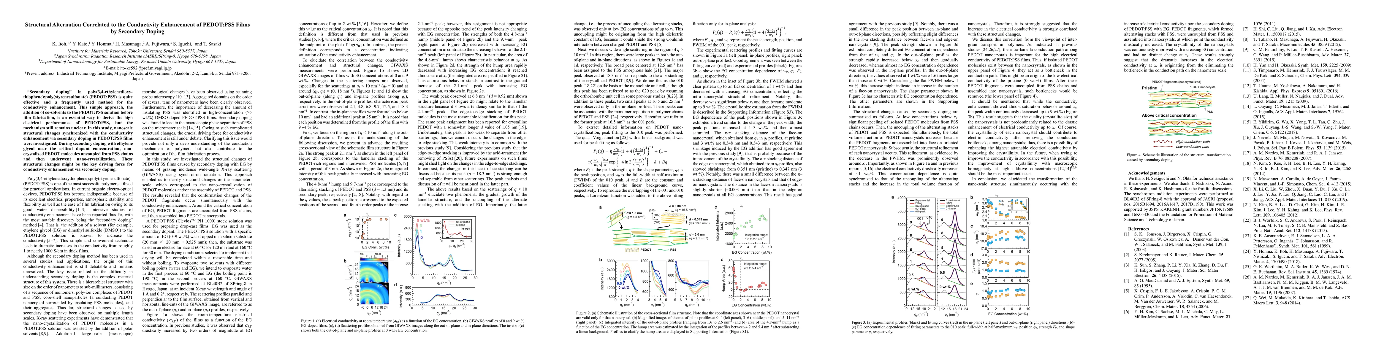 "Secondary doping" in poly(3,4-ethylenedioxy-thiophene):poly(styrenesulfonate) (PEDOT:PSS) is quite effective and a frequently used method for the conductivity enhancement. This simple approach, the addition of co-solvents to the PEDOT:PSS solution before film fabrication, is an essential way to derive the high electrical performance of PEDOT:PSS, but the mechanism still remains unclear. In this study, nanoscale structural changes synchronized with the conductivity enhancement via secondary doping in PEDOT:PSS films were investigated. During secondary doping with ethylene glycol near the critical dopant concentration, non-crystalized PEDOT molecules uncoupled from PSS chains and then underwent nano-crystallization. These structural changes might be the key driving force for conductivity enhancement via secondary doping.