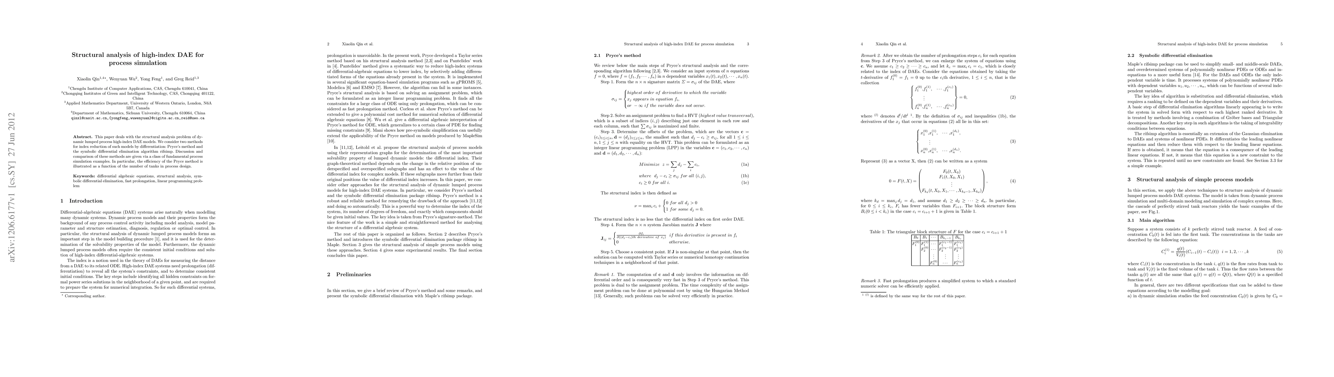 This paper deals with the structural analysis problem of dynamic lumped process high-index DAE models. We consider two methods for index reduction of such models by differentiation: Pryce's method and the symbolic differential elimination algorithm rifsimp. Discussion and comparison of these methods are given via a class of fundamental process simulation examples. In particular, the efficiency of the Pryce method is illustrated as a function of the number of tanks in process design.