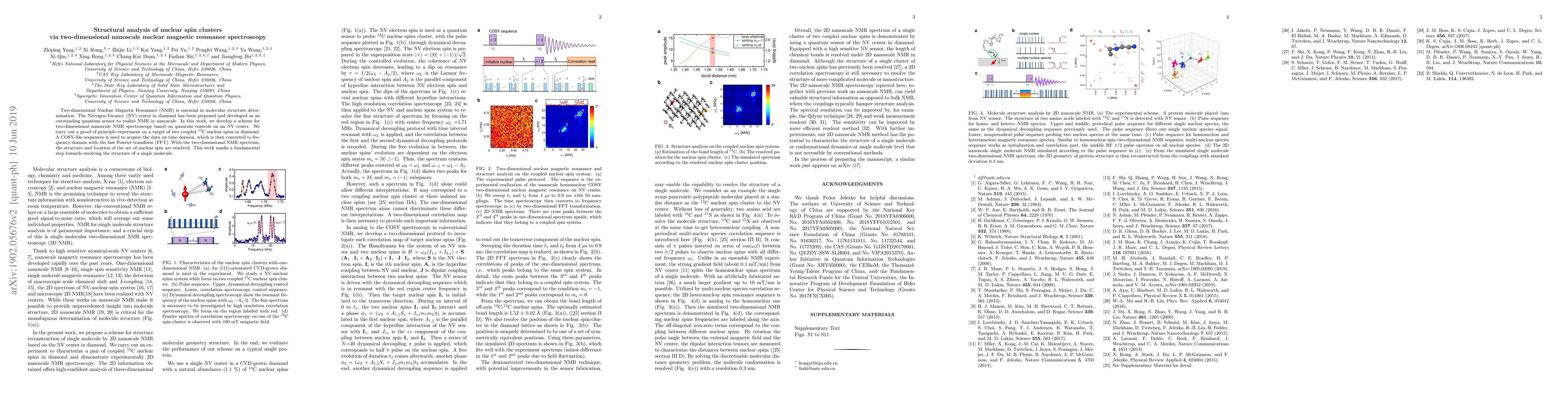 This paper develops a two-dimensional nanoscale NMR spectroscopy technique using an NV center in diamond to analyze nuclear spin clusters. A proof-of-principle experiment on two coupled $^{13}$C spins in diamond reveals the structure and location of the nuclear spins, marking a significant step towards single-molecule structure determination.