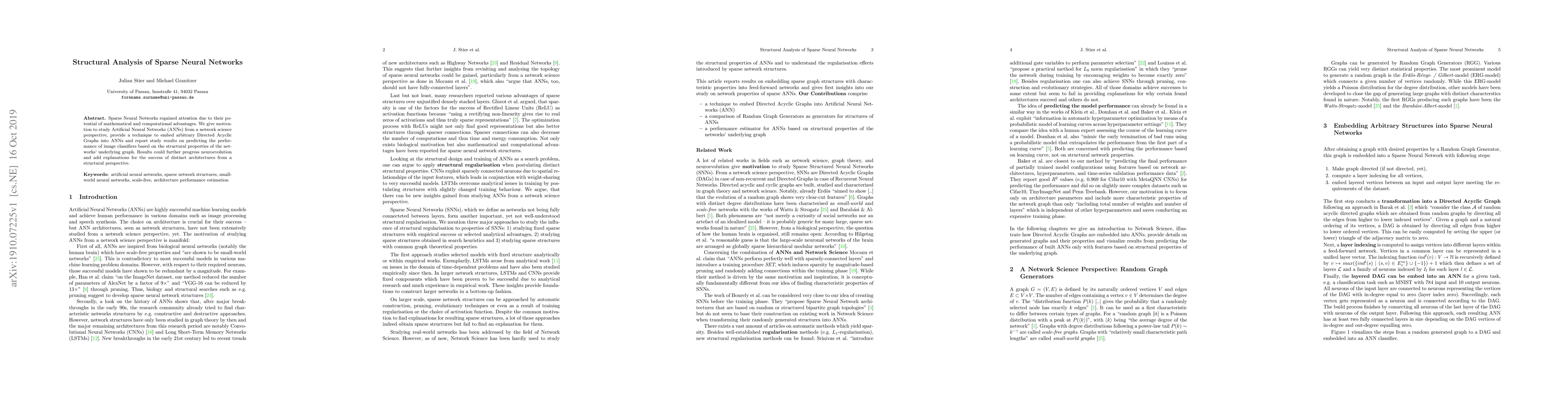This paper explores the structural advantages of sparse neural networks and proposes a method to embed Directed Acyclic Graphs into ANNs, demonstrating how structural properties predict image classifier performance, potentially advancing neuroevolution and providing insights into successful architectures.