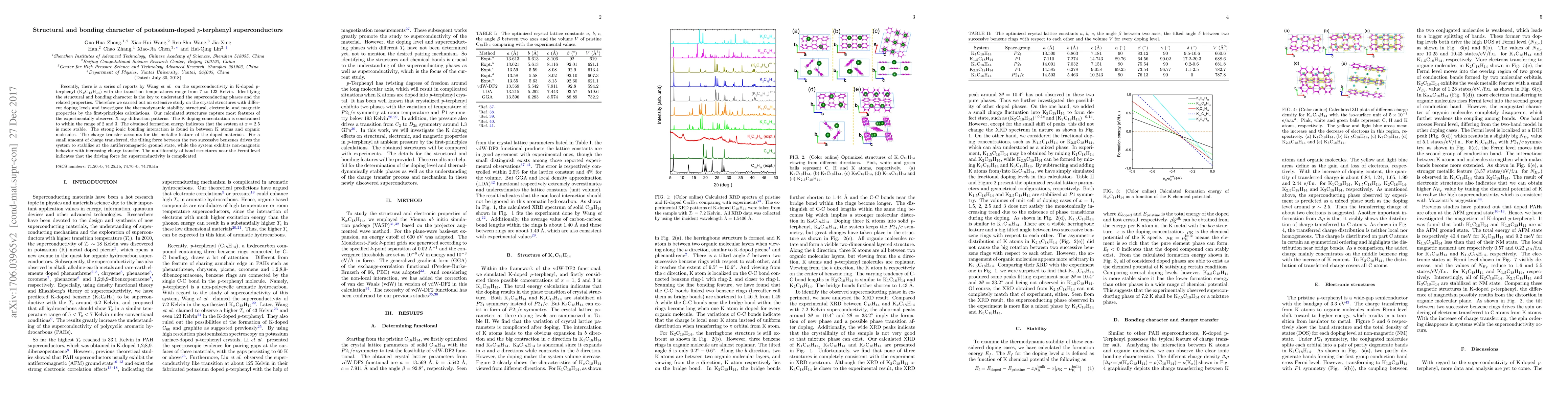This study investigates the structural and bonding characteristics of potassium-doped p-terphenyl superconductors, revealing that K doping at x = 2.5 is most stable. The research highlights strong ionic bonding and charge transfer, leading to metallic features and complex band structures near the Fermi level that drive superconductivity.