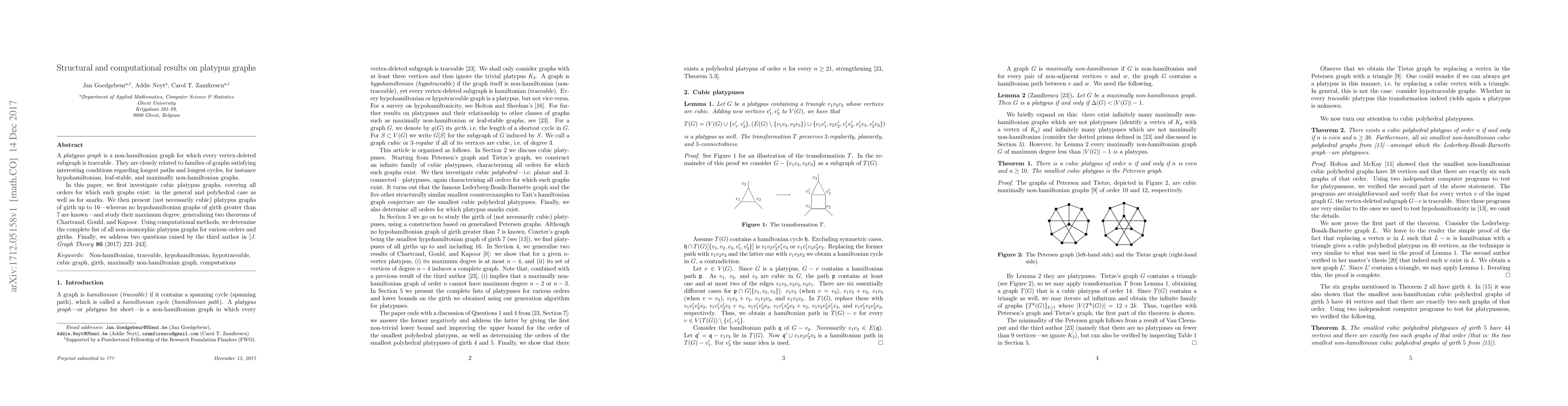 This paper investigates platypus graphs, non-hamiltonian graphs with every vertex-deleted subgraph traceable, focusing on cubic and higher-order structures up to girth 16. It uses computational methods to determine complete lists of non-isomorphic platypus graphs for various orders and girths.