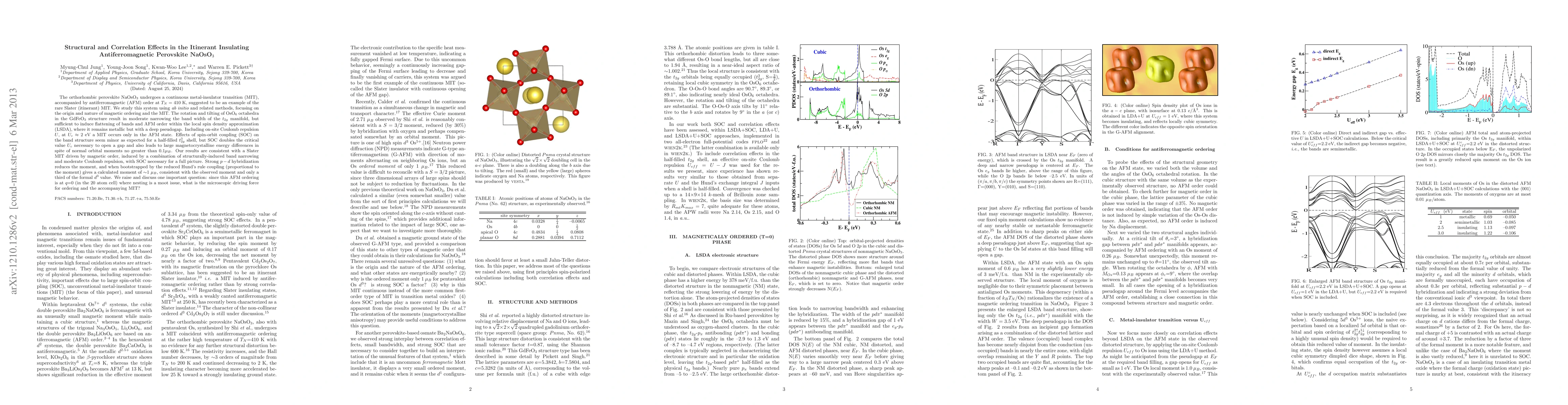 The orthorhombic perovskite NaOsO3 undergoes a continuous metal-insulator transition (MIT), accompanied by antiferromagnetic (AFM) order at T_N=410 K, suggested to be an example of the rare Slater (itinerant) MIT. We study this system using ab initio and related methods, focusing on the origin and nature of magnetic ordering and the MIT. The rotation and tilting of OsO6 octahedra in the GdFeO3 structure result in moderate narrowing the band width of the t_{2g} manifold, but sufficient to induce flattening of bands and AFM order within the local spin density approximation (LSDA), where it remains metallic but with a deep pseudogap. Including on-site Coulomb repulsion U, at U_c ~2 eV a MIT occurs only in the AFM state. Effects of spin-orbit coupling (SOC) on the band structure seem minor as expected for a half-filled $t_{2g}^{3}$ shell, but SOC doubles the critical value U_c necessary to open a gap and also leads to large magnetocrystalline energy differences in spite of normal orbital moments no greater than 0.1$\mu_B$. Our results are consistent with a Slater MIT driven by magnetic order, induced by a combination of structurally-induced band narrowing and moderate Coulomb repulsion, with SOC necessary for a full picture. Strong p-d hybridization reduces the moment, and when bootstrapped by the reduced Hund's rule coupling (proportional to the moment) gives a calculated moment of ~1 $\mu_B$, consistent with the observed moment and only a third of the formal $d^3$ value. We raise and discuss one important question: since this AFM ordering is at q=0 (in the 20 atom cell) where nesting is a moot issue, what is the microscopic driving force for ordering and the accompanying MIT?
