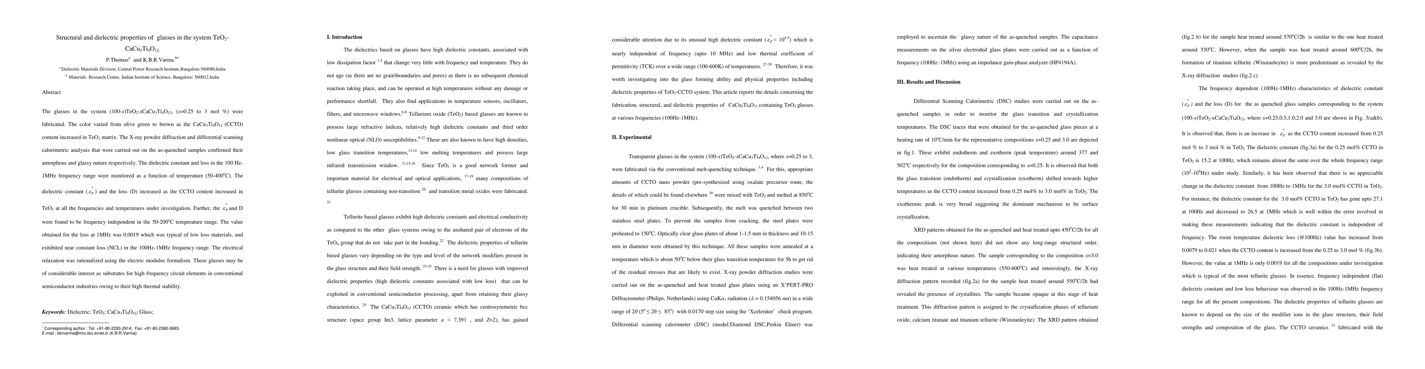 The glasses in the system (100-x)TeO2-xCaCu3Ti4O12, (x=0.25 to 3 mol %) were fabricated. The color varied from olive green to brown as the CaCu3Ti4O12 (CCTO) content increased in TeO2 matrix. The X-ray powder diffraction and differential scanning calorimetric analyses that were carried out on the as-quenched samples confirmed their amorphous and glassy nature respectively. The dielectric constant and loss in the 100 Hz-1MHz frequency range were monitored as a function of temperature (50-400oC). The dielectric constant and the loss (D) increased as the CCTO content increased in TeO2 at all the frequencies and temperatures under investigation. Further, the effective dielectric constant and D were found to be frequency independent in the 50-200oC temperature range. The value obtained for the loss at 1MHz was 0.0019 which was typical of low loss materials, and exhibited near constant loss (NCL) in the 100Hz-1MHz frequency range. The electrical relaxation was rationalized using the electric modulus formalism. These glasses may be of considerable interest as substrates for high frequency circuit elements in conventional semiconductor industries owing to their high thermal stability.