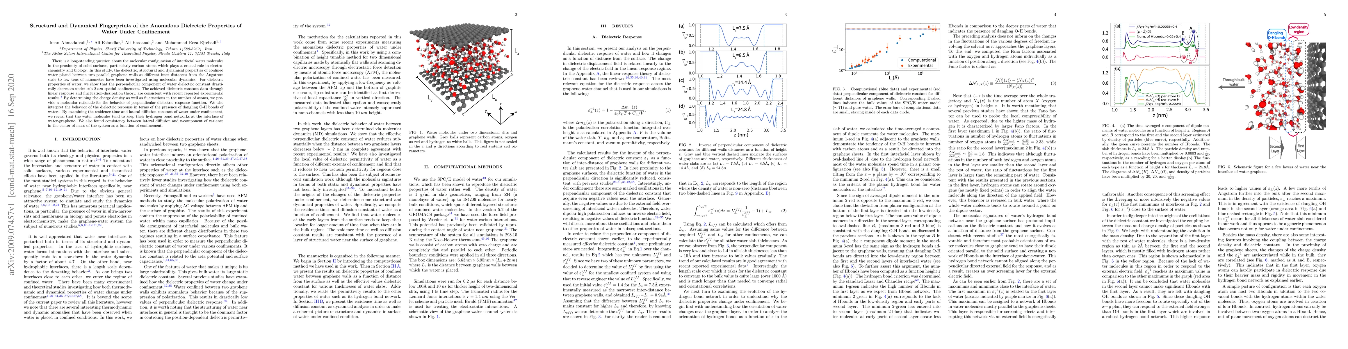 This study investigates the dielectric, structural, and dynamical properties of water confined between graphene walls using molecular dynamics. It reveals a significant decrease in the perpendicular dielectric constant under sub 2 nm confinement, consistent with experimental results, and attributes this to the presence of dangling O-H bonds and preserved hydrogen bond networks.
