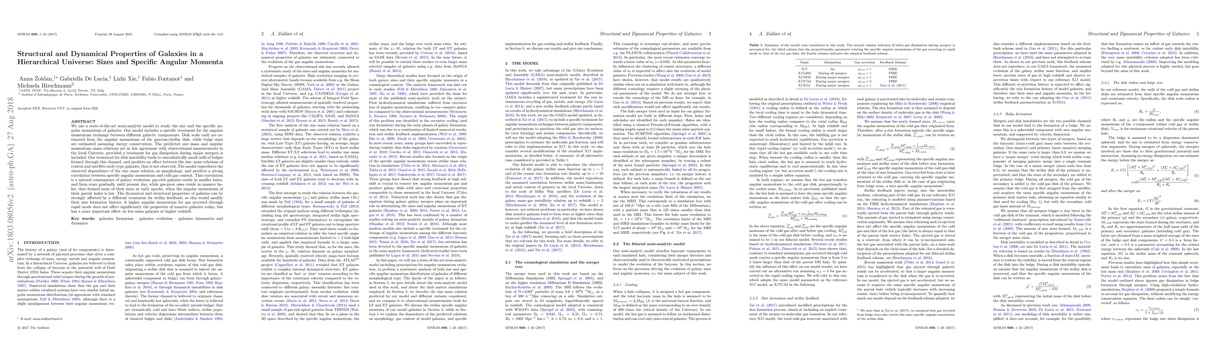 This paper uses a semi-analytic model to investigate the size and specific angular momentum of galaxies in a hierarchical universe, finding good agreement with local observations. It highlights the impact of gas dissipation and stellar feedback on galaxy properties, noting that angular momentum affects low-mass galaxies more significantly at higher redshifts.