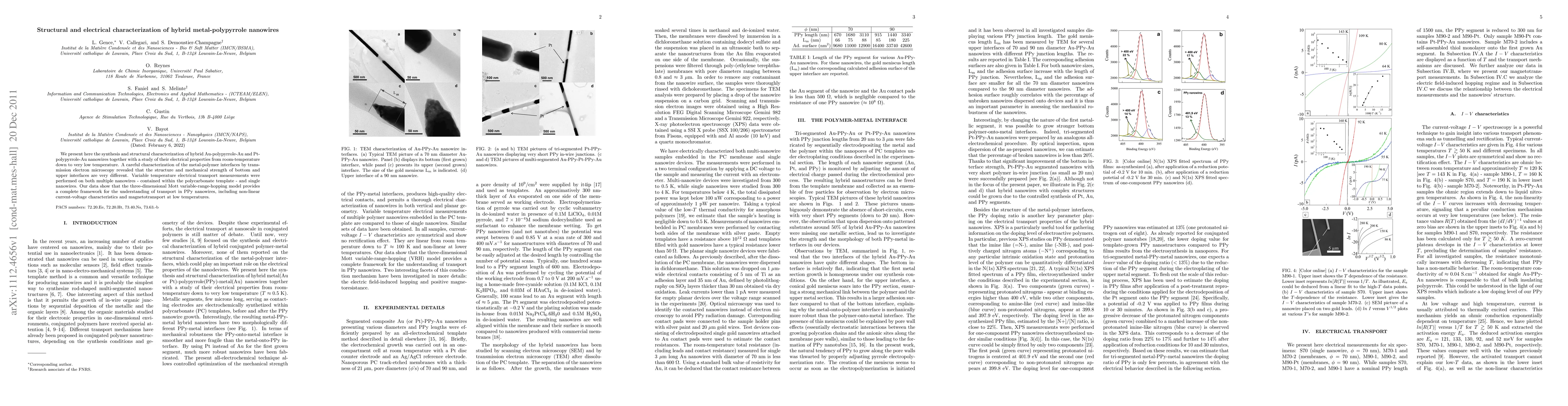 We present here the synthesis and structural characterization of hybrid Au-polypyrrole-Au and Pt- polypyrrole-Au nanowires together with a study of their electrical properties from room-temperature down to very low temperature. A careful characterization of the metal-polymer interfaces by trans- mission electron microscopy revealed that the structure and mechanical strength of bottom and upper interfaces are very different. Variable temperature electrical transport measurements were performed on both multiple nanowires - contained within the polycarbonate template - and single nanowires. Our data show that the three-dimensional Mott variable-range-hopping model provides a complete framework for the understanding of transport in PPy nanowires, including non-linear current-voltage characteristics and magnetotransport at low temperatures.