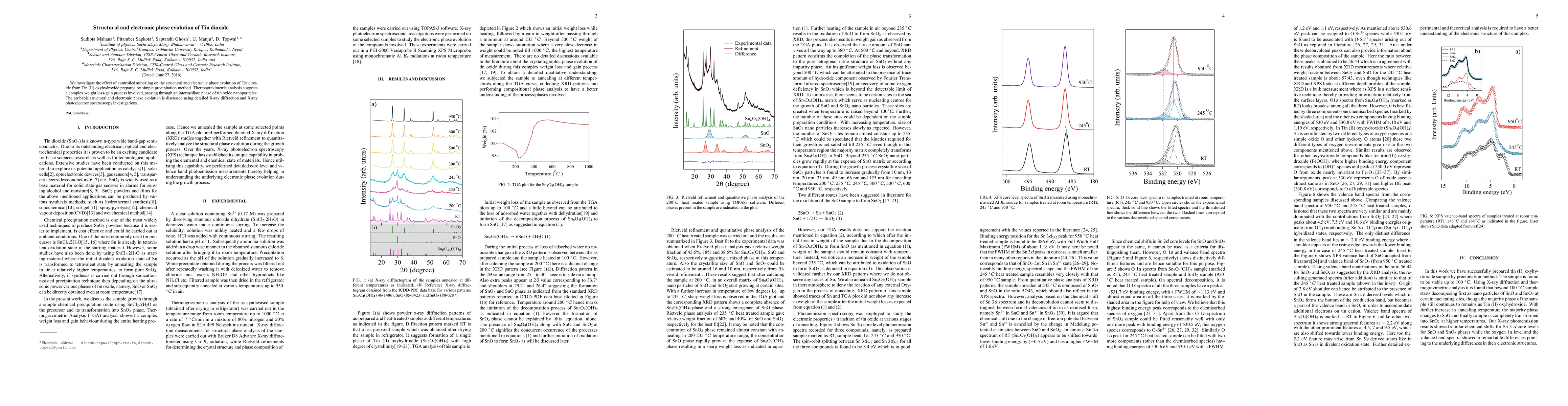 We investigate the effect of controlled annealing on the structural and electronic phase evolution of Tin dioxide from Tin (II) oxyhydroxide prepared by simple precipitation method. Thermogravimetric analysis suggests a complex weight loss-gain process involved, passing through an intermediate phase of tin oxide nanoparticles. The probable structural and electronic phase evolution is discussed using detailed X-ray diffraction and X-ray photoelectron spectroscopy investigations.