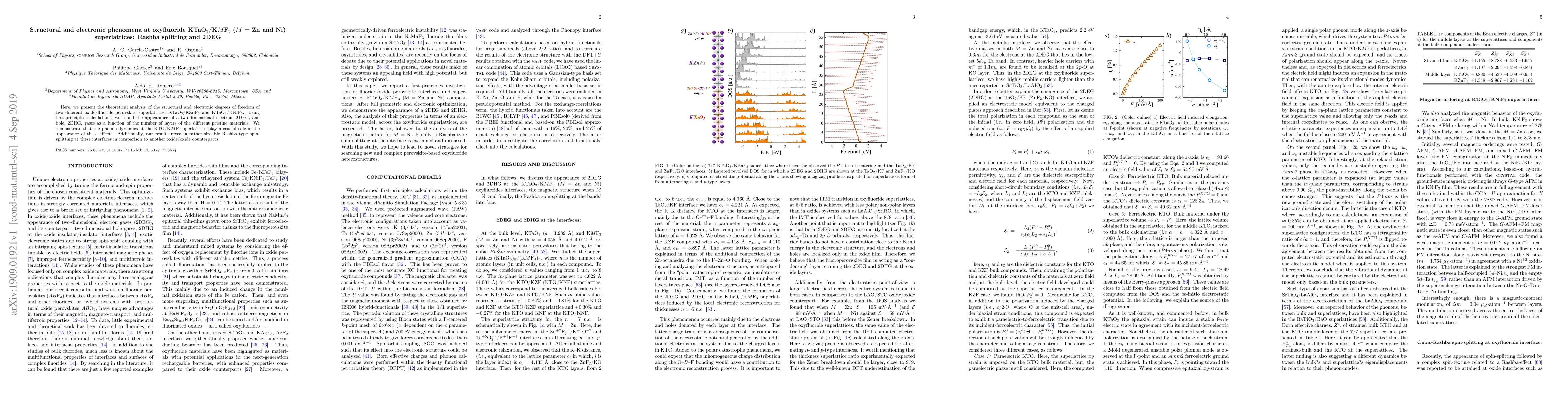 Here, we present the theoretical analysis of the structural and electronic degrees of freedom of two different oxide/fluoride perovskite superlattices, KTaO$_3$/KZnF$_3$ and KTaO$_3$/KNiF$_3$. Using first-principles calculations, we found the appearance of a two-dimensional electron, 2DEG, and hole, 2DHG, gases as a function of the number of layers of the different pristine materials. We demonstrate that the phonon-dynamics at the KTO/K$M$F superlattices play a crucial role in the appearance of these effects. Additionally, our results reveal a rather sizeable Rashba-type spin-splitting at these interfaces in comparison to another oxide/oxide counterparts.